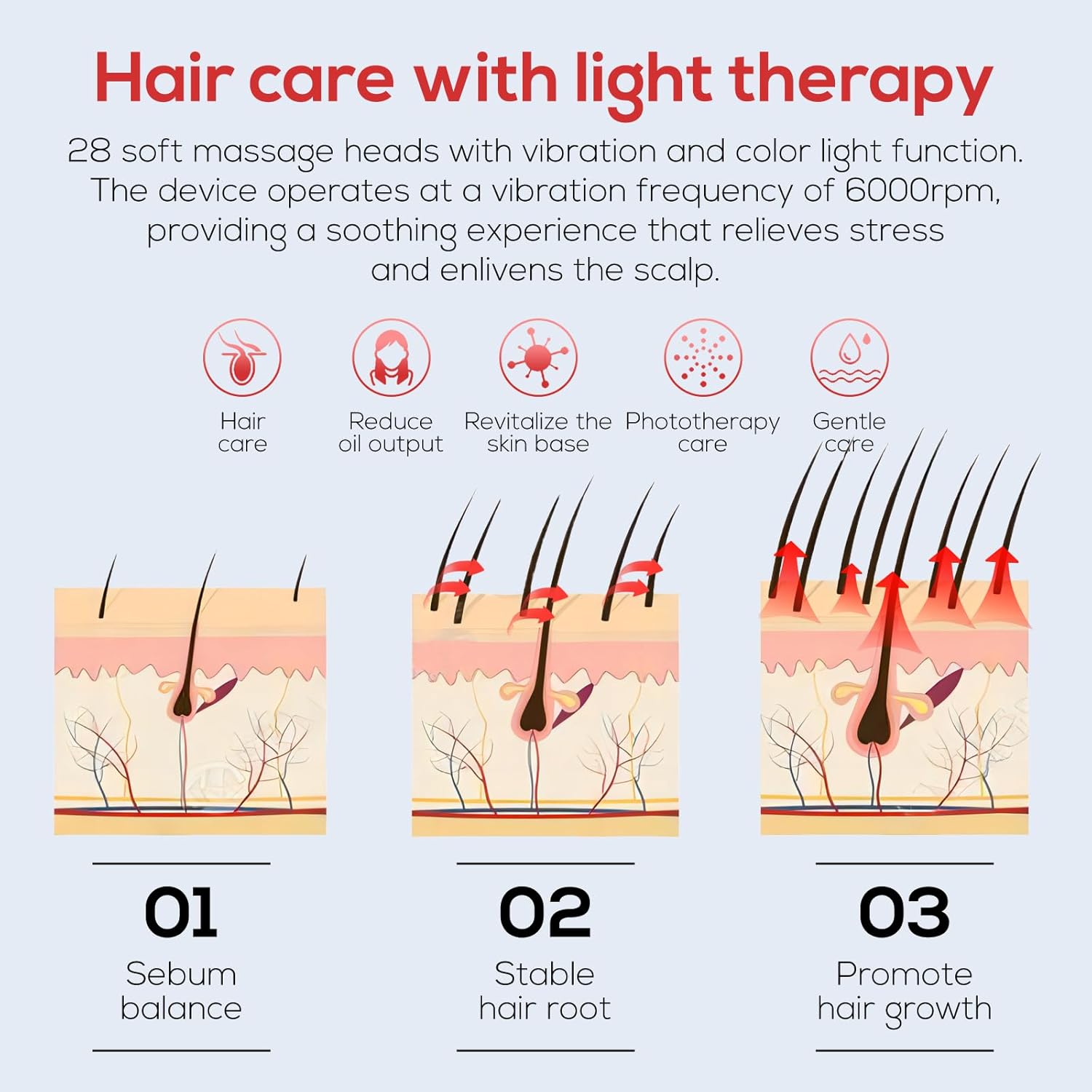 ♦♦ Quick Results ♦♦ : Our red-light therapy device operates at 7500 vibrations per minute. Achieve fuller, denser, and healthier hair with 3-4 weekly 15-minute treatments every other day, consistently for 6 months. Long-term use of the scalp massager also resolves issues such as hair loss, knots, widened gaps, headaches, and lack of concentration.