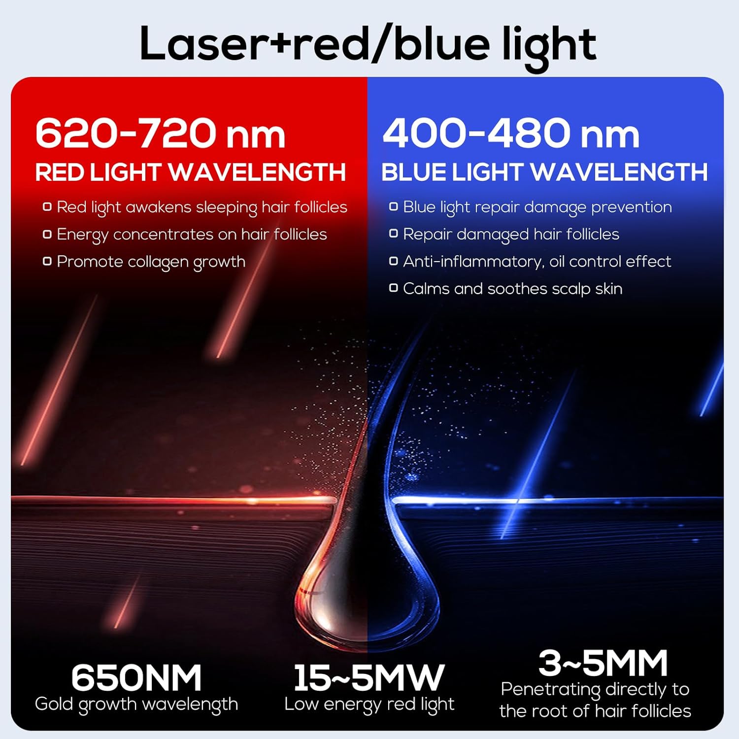 ♦♦ Red & Blue Light Benefits ♦♦ : This laser therapy comb device include red and blue light . The red light (620-720 nm) enhances blood circulation, stimulates collagen growth, and encourages new hair growth. Meanwhile, the blue light (400-480 nm) offers anti-inflammatory effects, controls scalp oil, and promotes a relaxed and calm scalp.