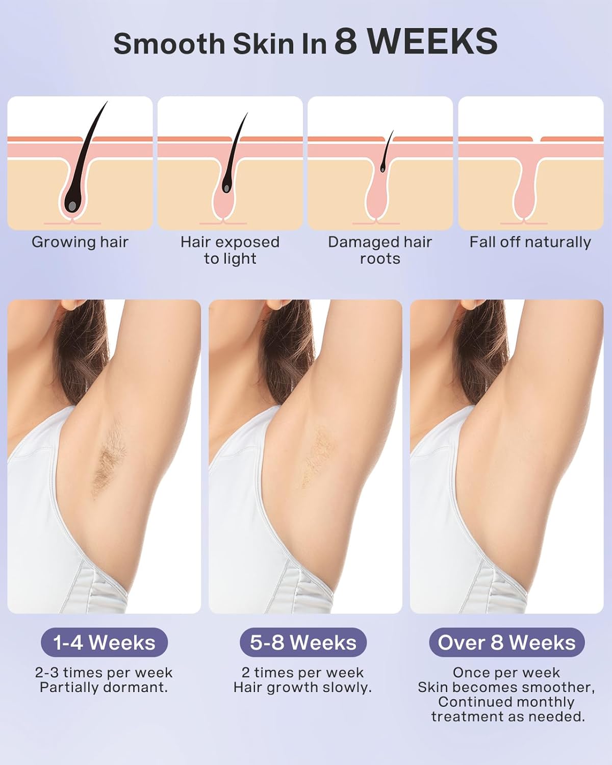 【Laser Hair Removal Device】Compared to expensive salon hair removal, our hair removal devices are safe, easy,gentle and effective to use at home, and it costs less. Permanently reduce hair in just 8 weeks.