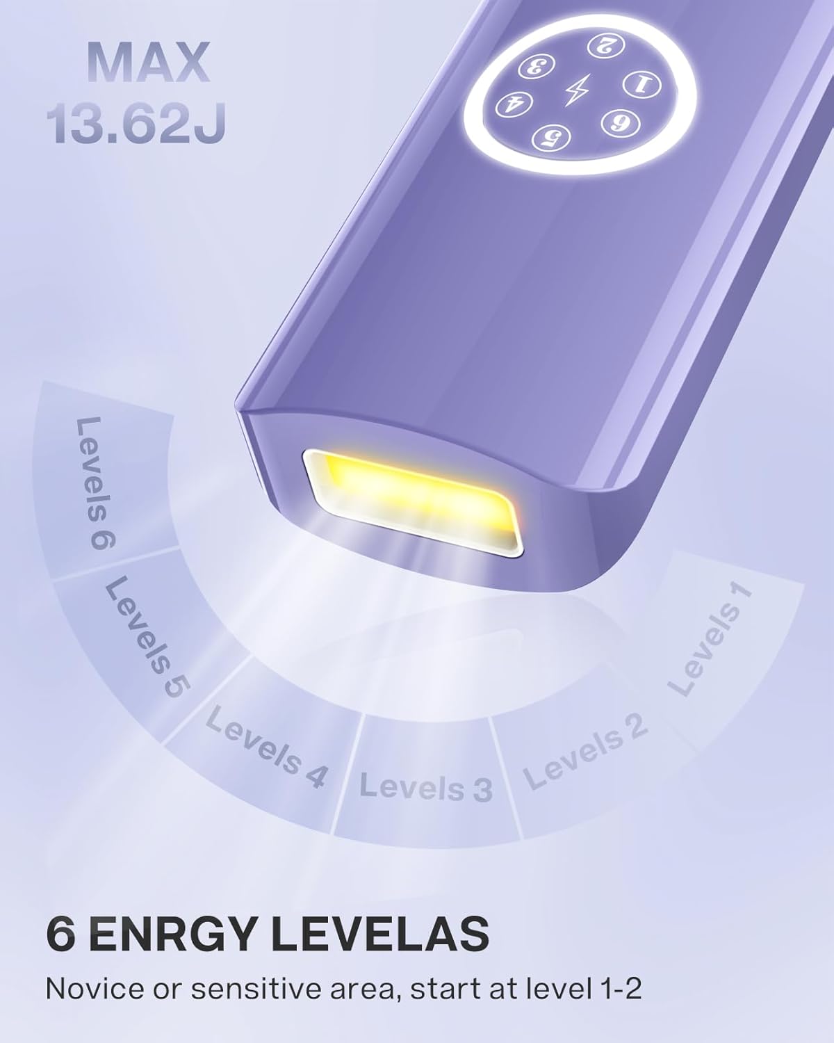 【6 Levels】6 energy levels, suitable for different areas of skin, the higher the energy level, the better the hair removal effect.