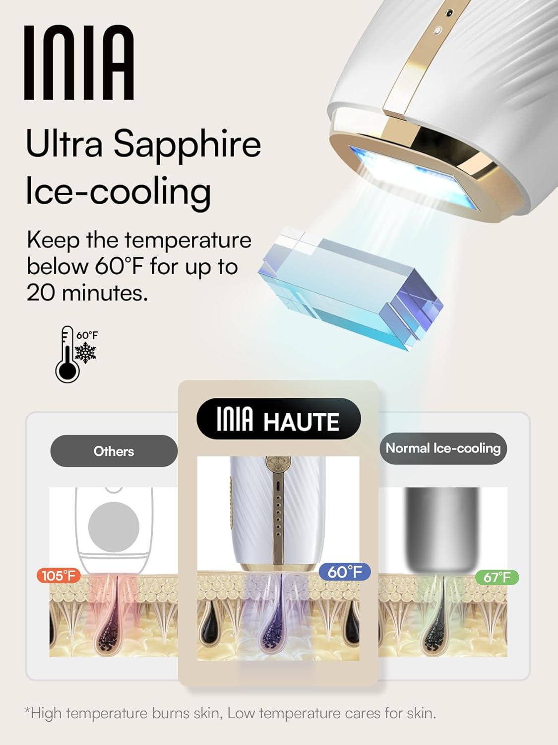 𝐔𝐥𝐭𝐫𝐚 𝐒𝐚𝐩𝐩𝐡𝐢𝐫𝐞 𝐈𝐜𝐞-𝐜𝐨𝐨𝐥𝐢𝐧𝐠 𝐛𝐞𝐥𝐨𝐰 𝟓𝟎°𝐅: Experience a refreshing icy sensation with INIA’s advanced Sapphire Ice Cooling. While others offer 105°F or normal ice-cooling at 67°F, INIA maintains a cool 50°F for ultimate comfort. Guarding your skin against heat injury while delivering the ultimate in comfort and effectiveness.