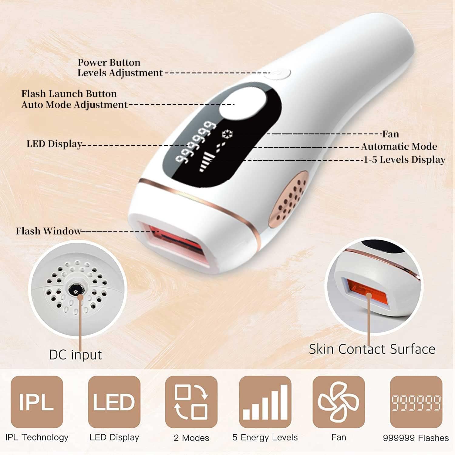 【Laser Hair Removal】This hair removal permanent has 5 adjustable energy levels to accommodate different skin sensitivities and treatment area.2-button design,easy to use and adjust energy levels and modes. you can easy control the state when operate.