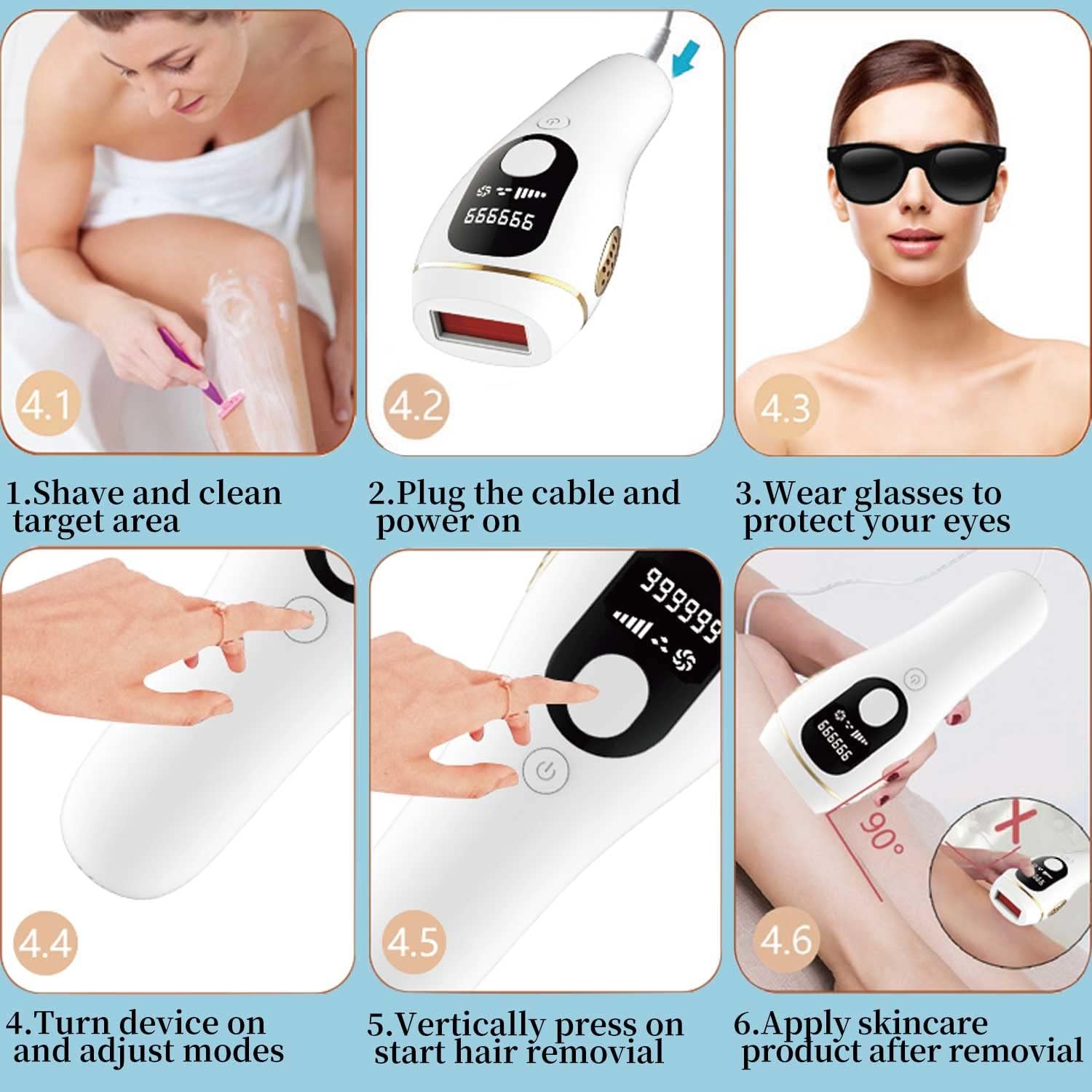 【Laser Hair Removal for Women】The IPL hair removal equipment has real 999,999 flashes, which is enough in lifetime use.This hair removal designed with Large LCD, which makes it easier to see all data at a glance such as clear display of remaining number for flashes times.