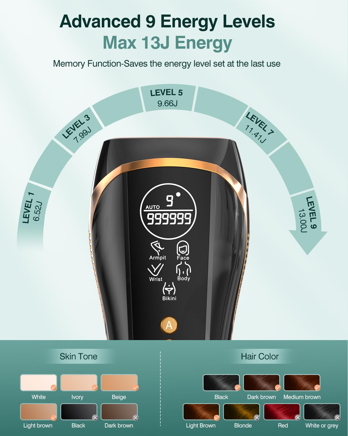 【999999 Flashes Hair Removal 】IPL Hair Removal Device with max limit of 999,999 flashes, which is enough to use 10-15 years.You will see clearly how many flashes are left on the liquid crystal display.