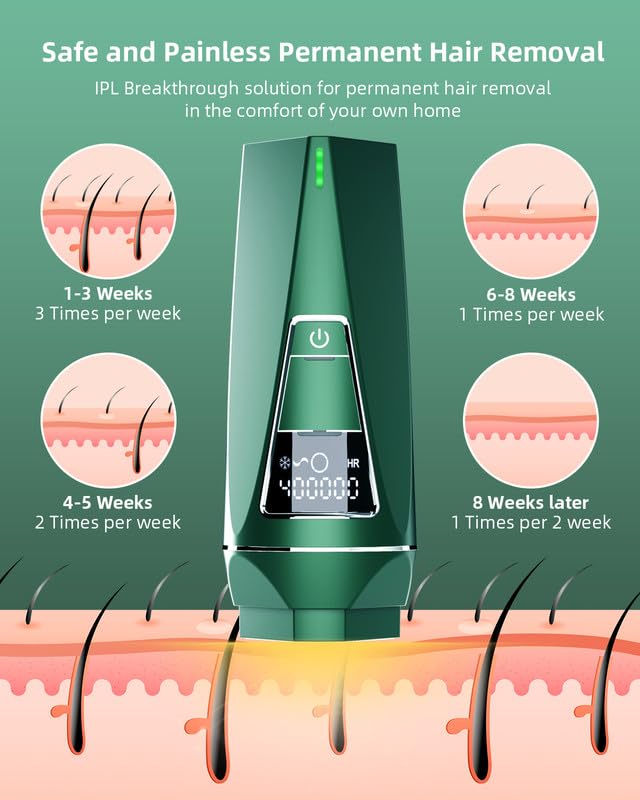 Just 10 Minutes: Full body hair removal in just 10 minutes with powerful 4 square centimeters of light outlet; Use the hair removal device twice a week for 8 consecutive weeks, you will get smooth and fair skin without any black hair spots.