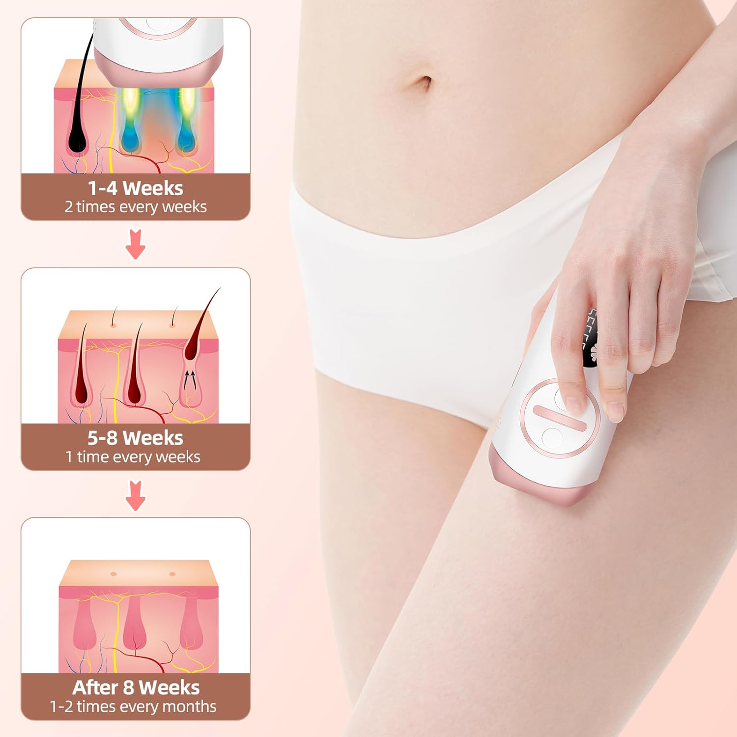 【Permanent & 999,999 Flashes】The principle is to emit a strong intense pulse light and be absorbed by the hair follicle, the hair removal device breaks the cycle of hair regrowth, stimulates hair follicle to enter dormant period to achieving permanent hair removal result. Visible hair reduction in just 6-8 weeks.Upgraded 999,999 flashes enough for your whole family use. You can get the same hair removal effect as that in a beauty salon and spend less money.