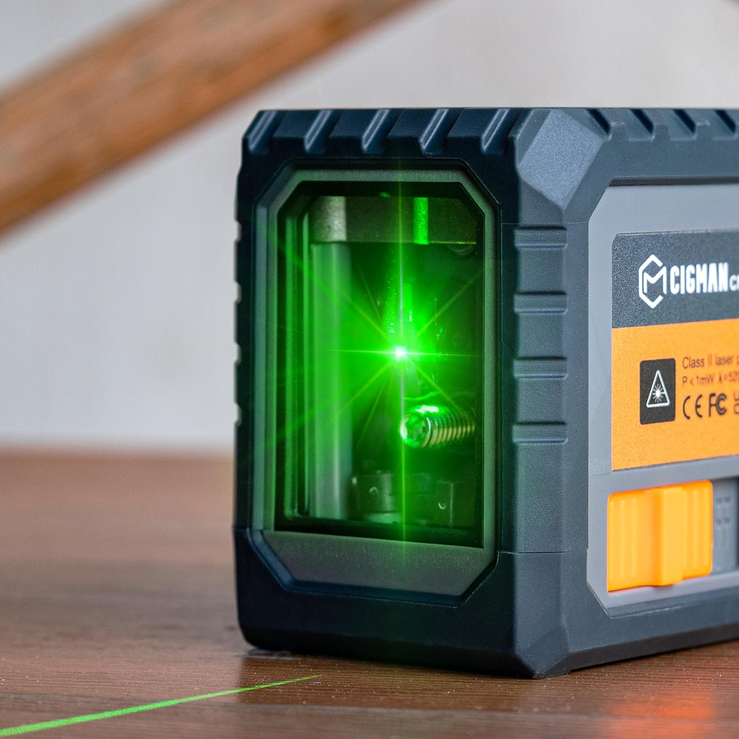 The CIGMAN CM-G02 Crosshair Laser projects horizontal and vertical laser lines and features an automatic leveling function to ensure precise alignment work. Green laser technology offers 4 times the visibility of red laser line devices.