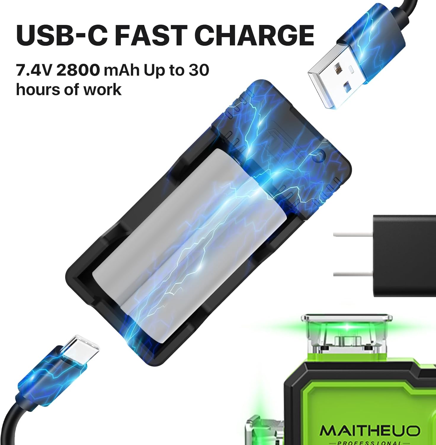 Rechargeable Battery & Low Battery Warning: The line lasers is equipped with a 7.4V 2800mAh battery, which can working up to 30h. The laser level has a power level display. When the laser level is out of power, it will issue a warning. With a TYPE-C charger and battery charger, it can work for 30 hours on a 5 hour charge.