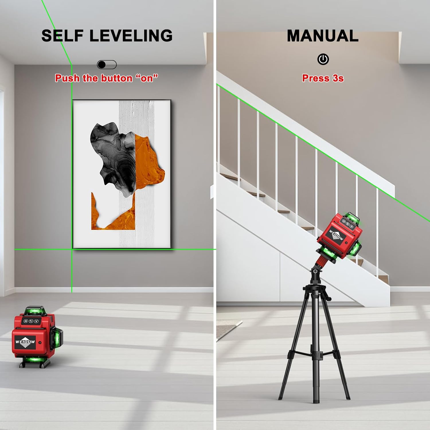 Laser Level,WEIDDW 4D 16 Lines Laser Level 4×360 Self Leveling Tool for Construction and Picture Handing Green Cross Line Vertical and Horizontal Line leveler Tool with Two Rechargable Batteries