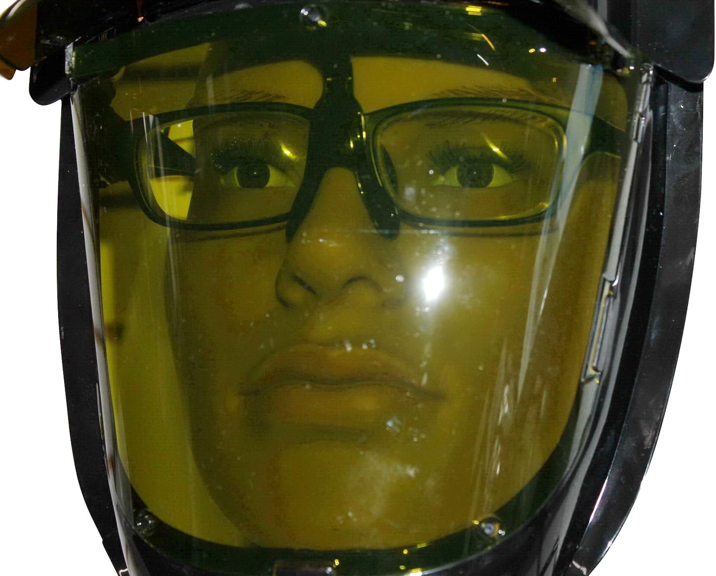 Materials:Optical Polycarbonate Sheet Invisible light protection wavelength:200-460 nm, 900-2000 nm. Invisible light protection rate: Maximum eye protection rate – OD5(99.999%) Visible light transmission rate: Single Layer – 40%, Double Layer – 16% Weight: 4 oz. Dimensions: 9 in H * 7.6 in W, main face cover area 5.5 * 5.5 in,Frame legs length 5 in. Other features: Light color model can read computer screen, text etc. User friendly for person wearing glasses.
