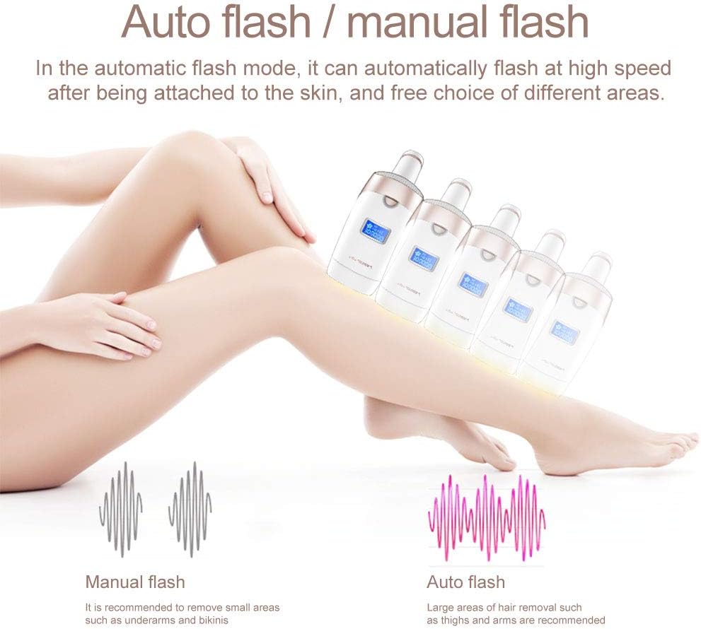 ♠2 Flash Modes — The permanent laser hair removal with a long service life with 400,000+ flashes. Two flash modes, manual and auto mode supported. Manual mode used for precision areas, like bikini lines, underarms, chin, fingers; Auto mode used for large areas, like arms, legs, stomach, back. It will greatly reduce treatment time.