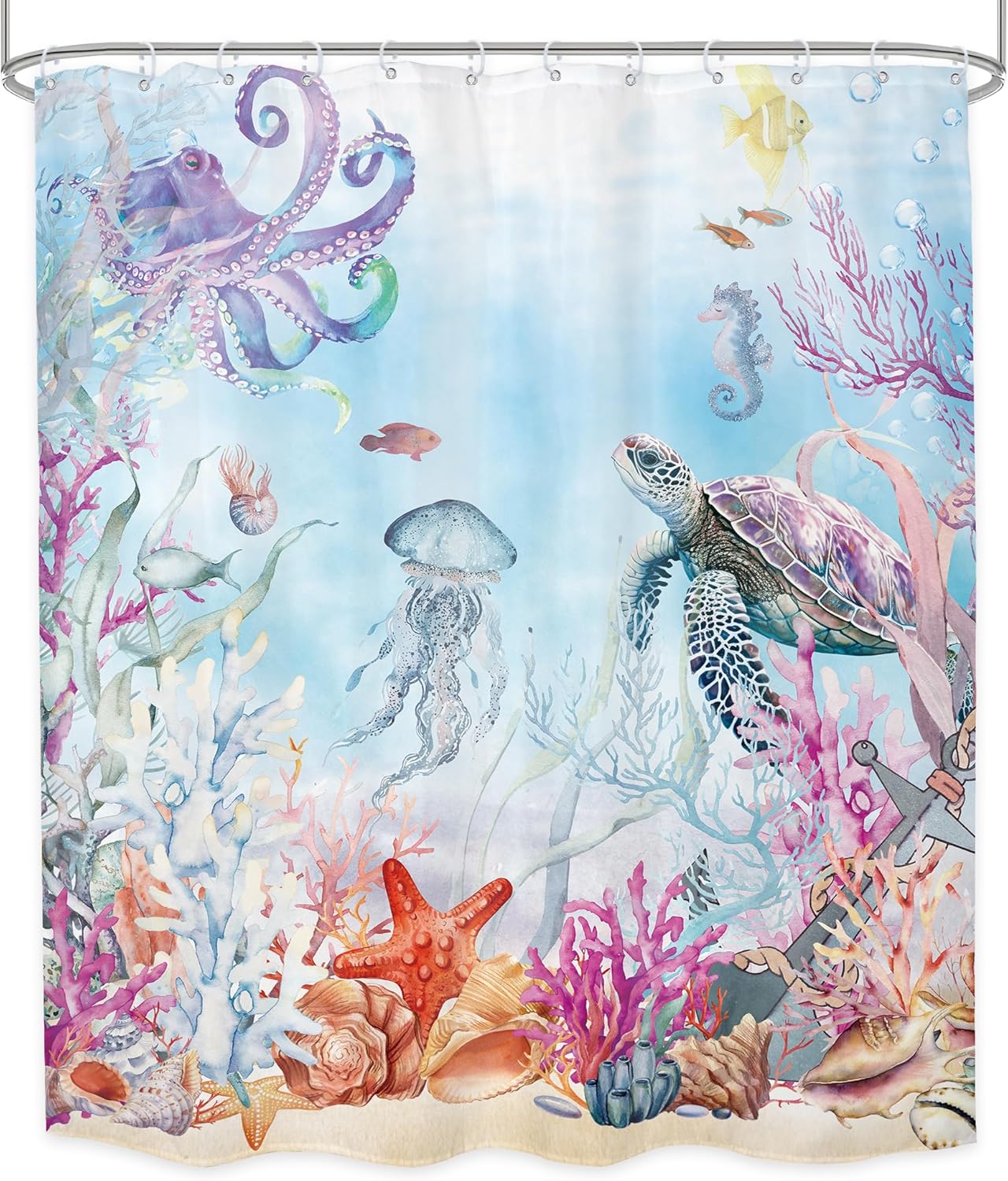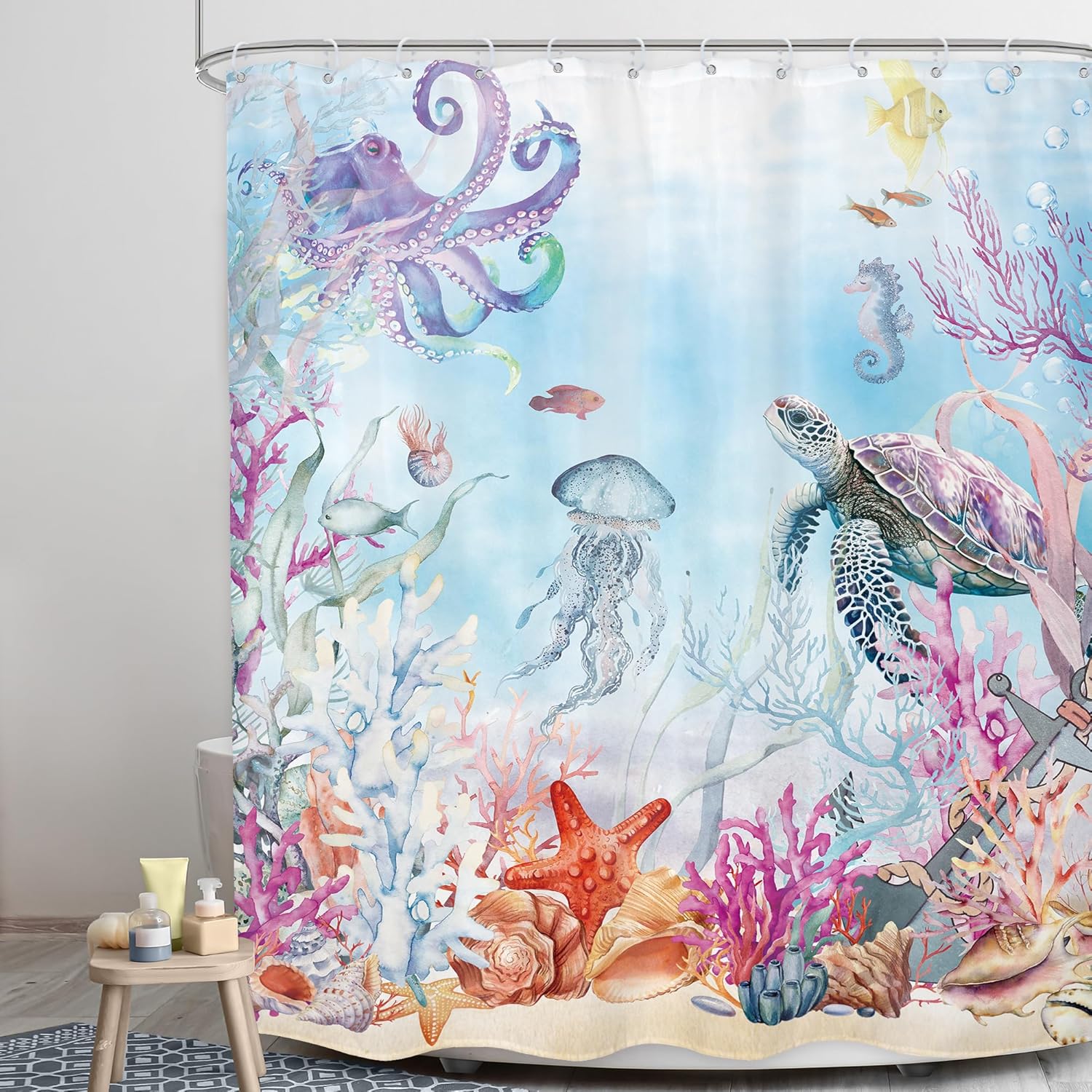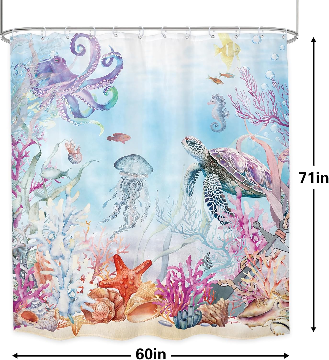 LGhtyro Kids Ocean Sea Animal Shower Curtain Bathroom Set 60Wx71H Inches Underwater Turtle Octopus Jellyfish Starfish Conch Bath Accessories Tropical Coral Plant Art Home Decor Fabric 12 Pack Hooks
