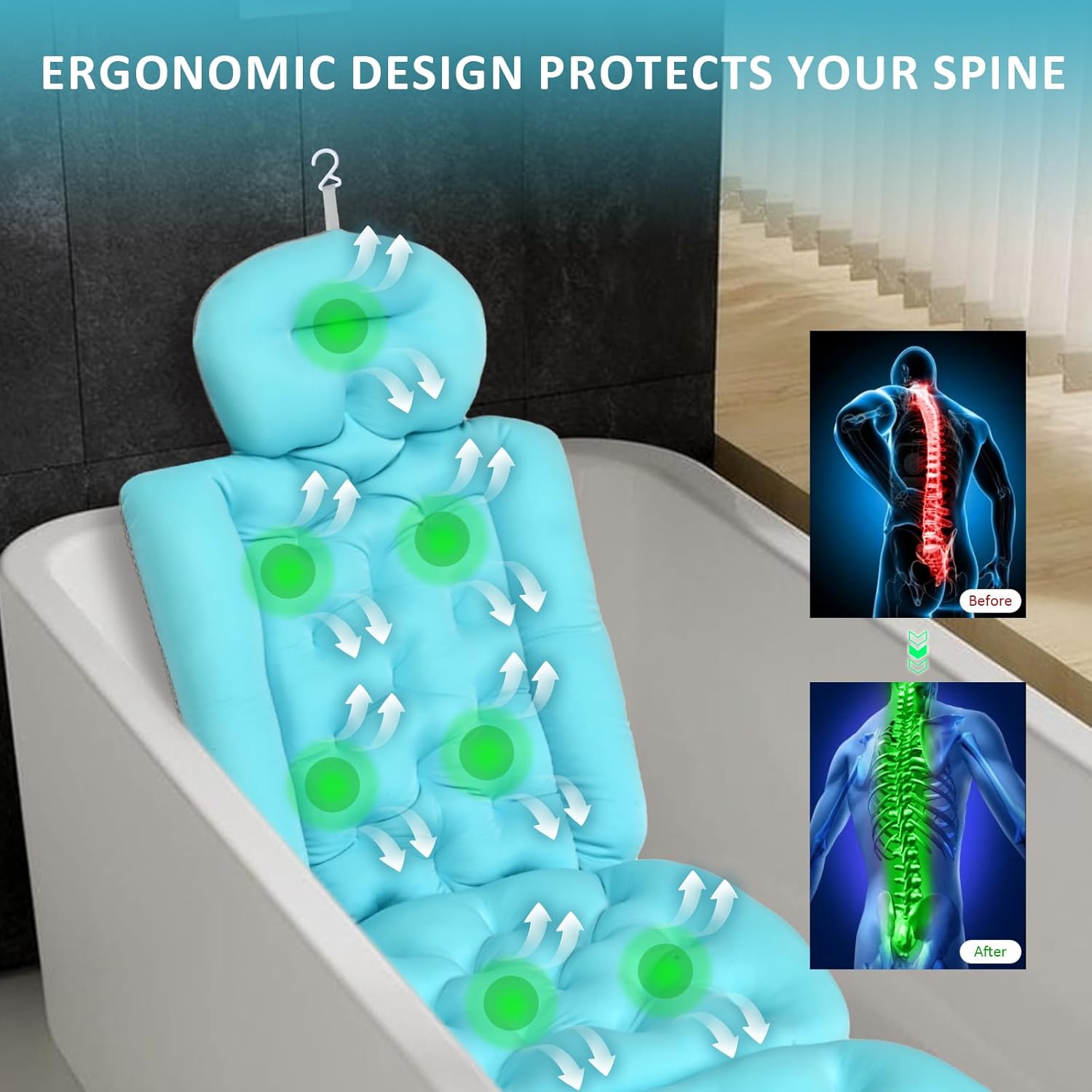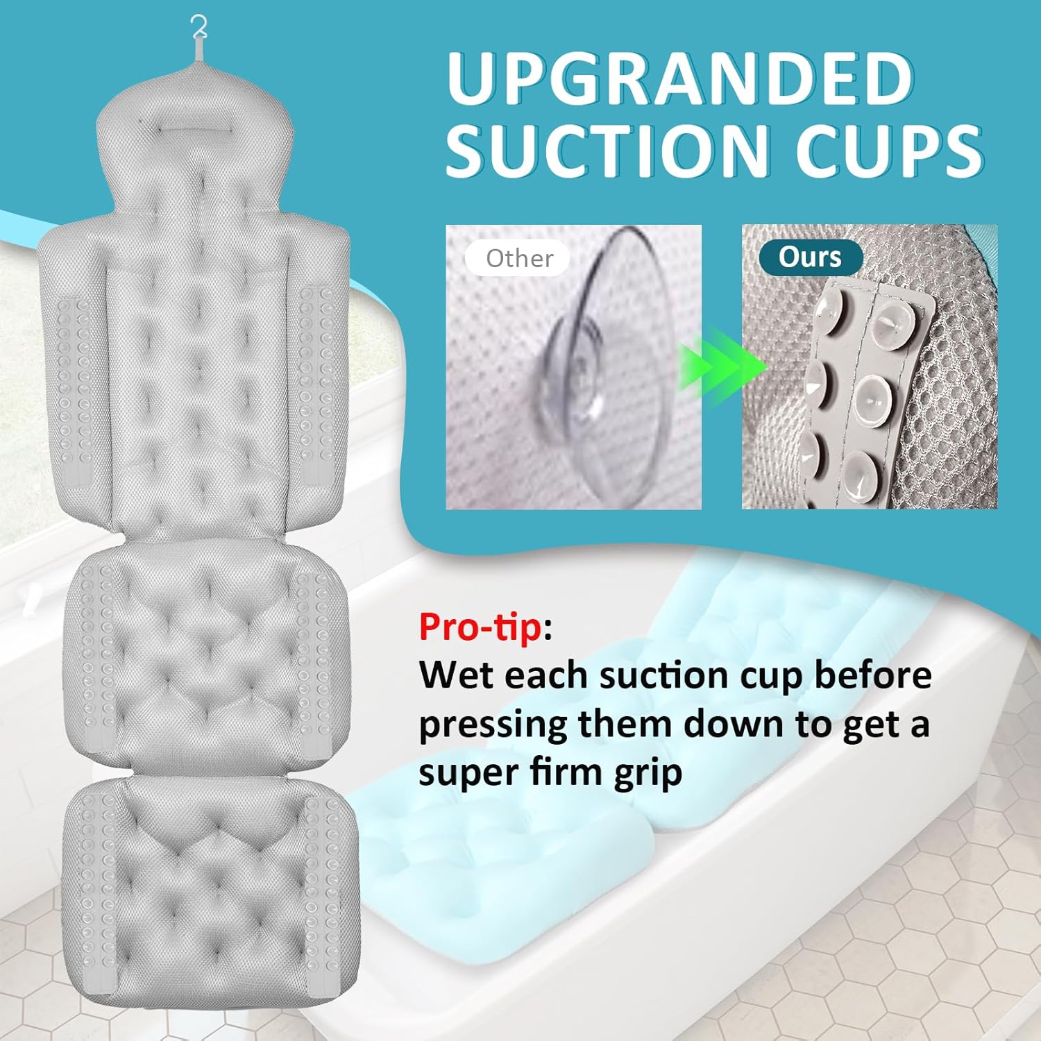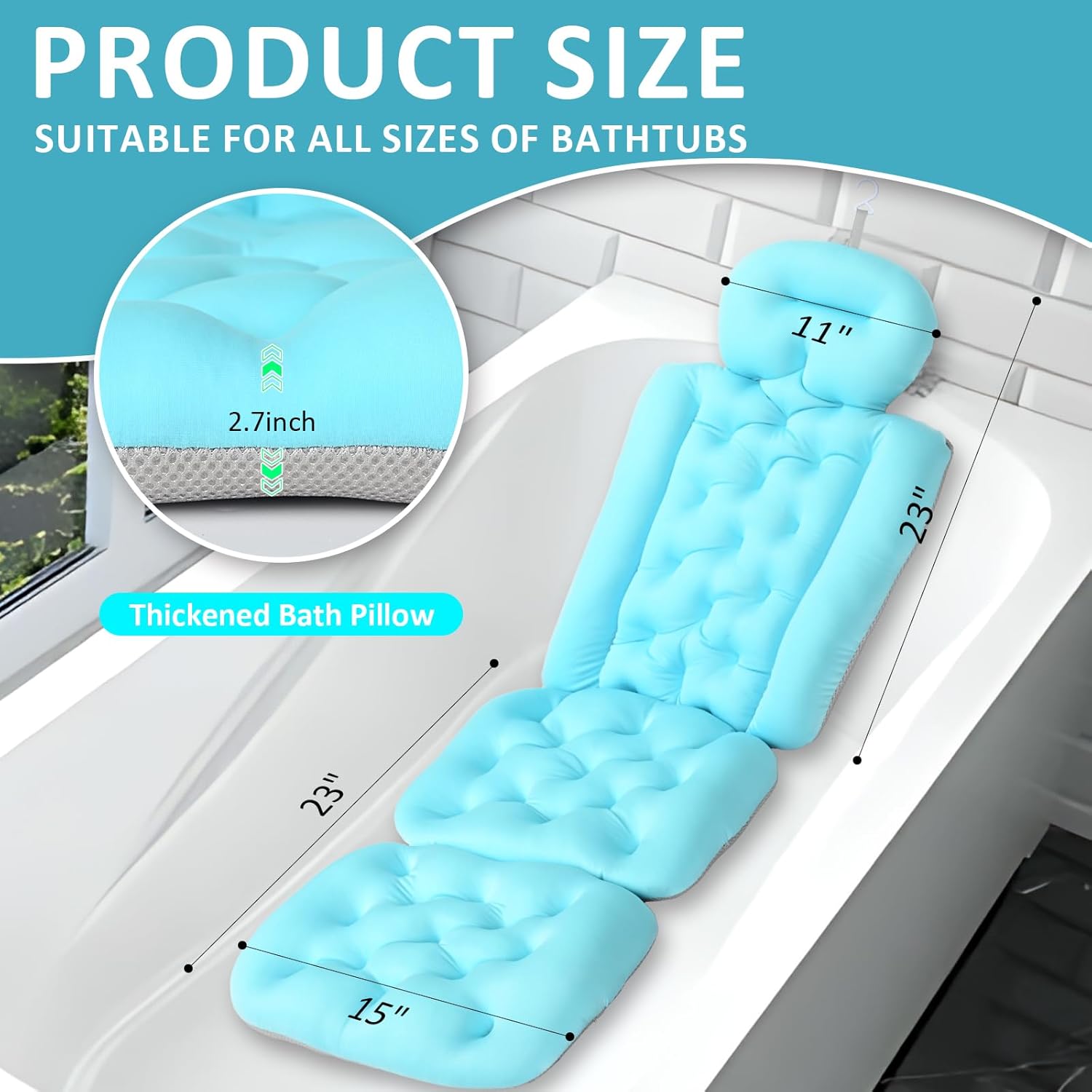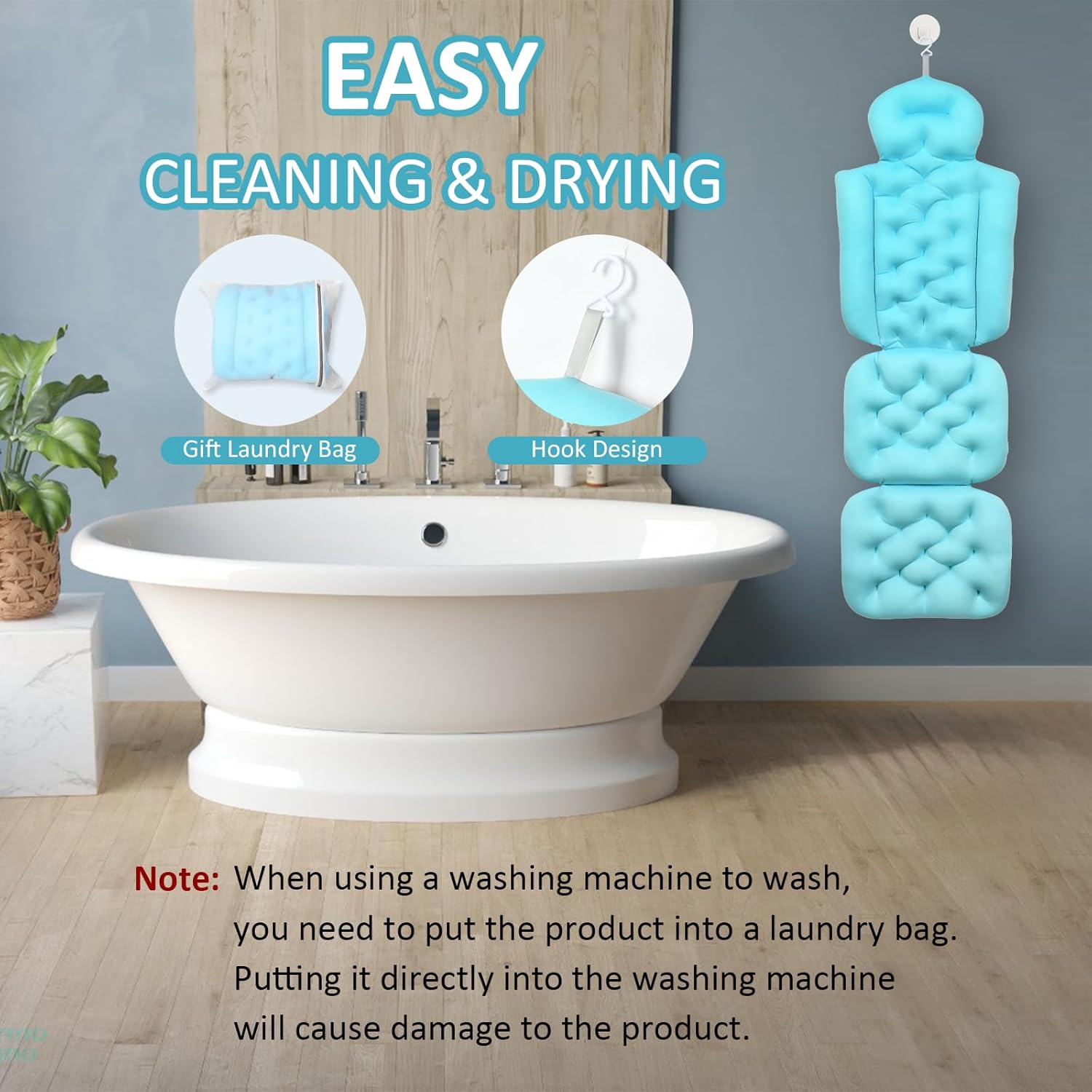 【Easy Clean and Premium Quality】It is easy to clean by hand, or machine wash with the supplied mesh laundry bag to prevent the suction cups from stick to the machine’s drum or being torn off. This bathtub pillow full body comes with a convenient built-in hanging hook for easy quick drying and storage.