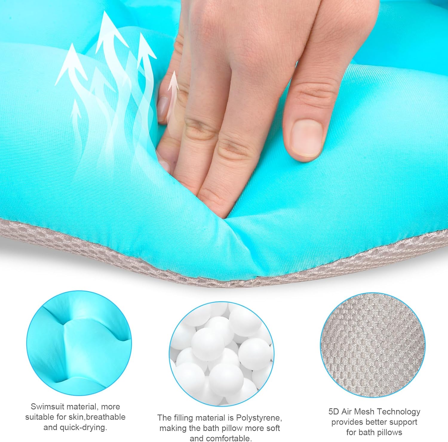 【Upgraded Non-Slip suction cups】Tired of the Suction Cups that are constantly slides and even floats around while you are bathing? Our bath pillow equipped with powerful suction cups on the underside, which can firmly fix the bath pillow in place on any smooth surfaces with great ease (not suitable for textured surfaces!). Before using this bathtub pillow, wet each suction cup. Then firmly press the pillow corresponding to EACH (IMPORTANT) suction cup to the front of the bathtub.