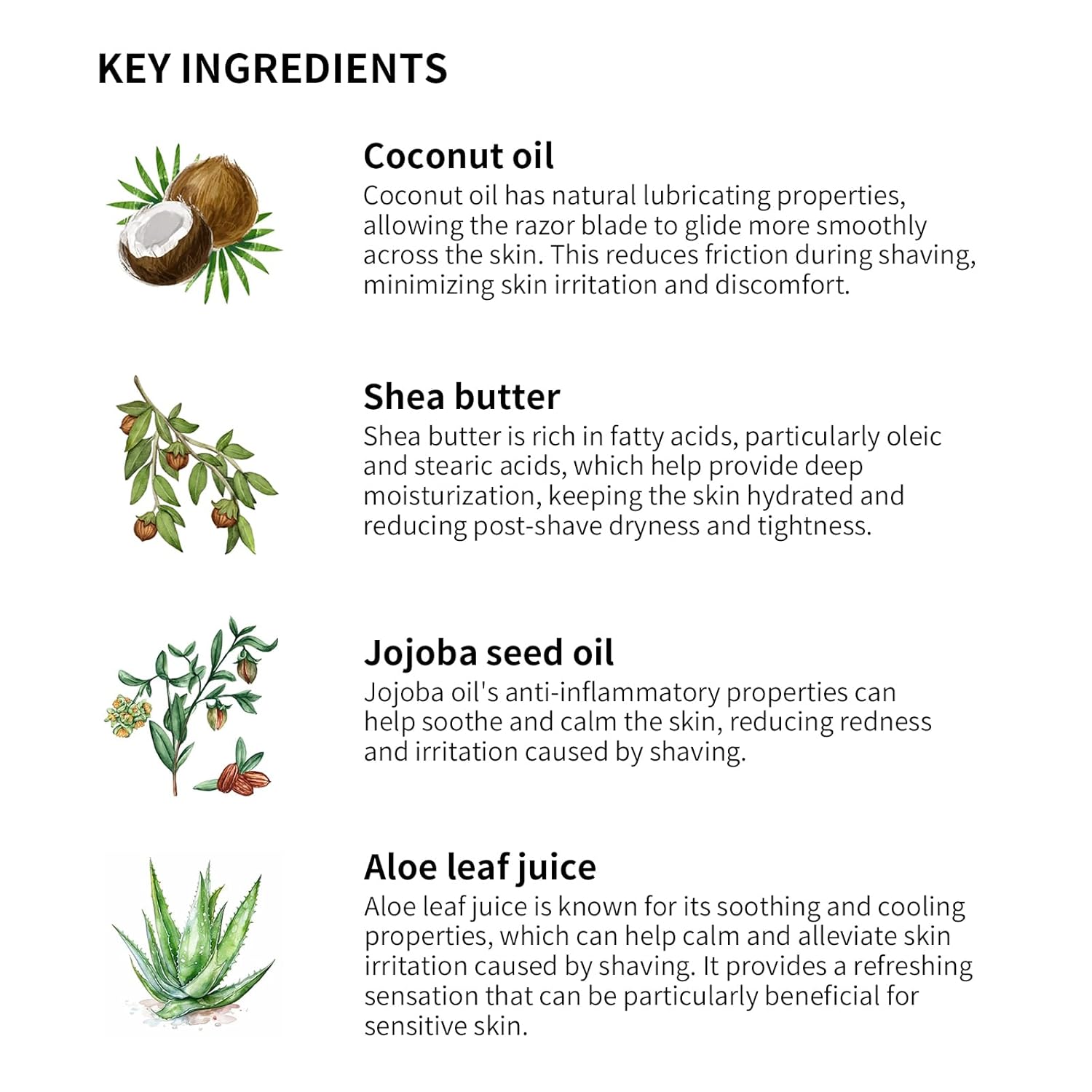 DEEP HYDRATION — Our Men’s Hydrating Shaving Cream is formulated with Glycerin, Shea Butter, and Coconut Oil to provide deep hydration, ensuring your skin stays moisturized and supple throughout the entire shaving process.