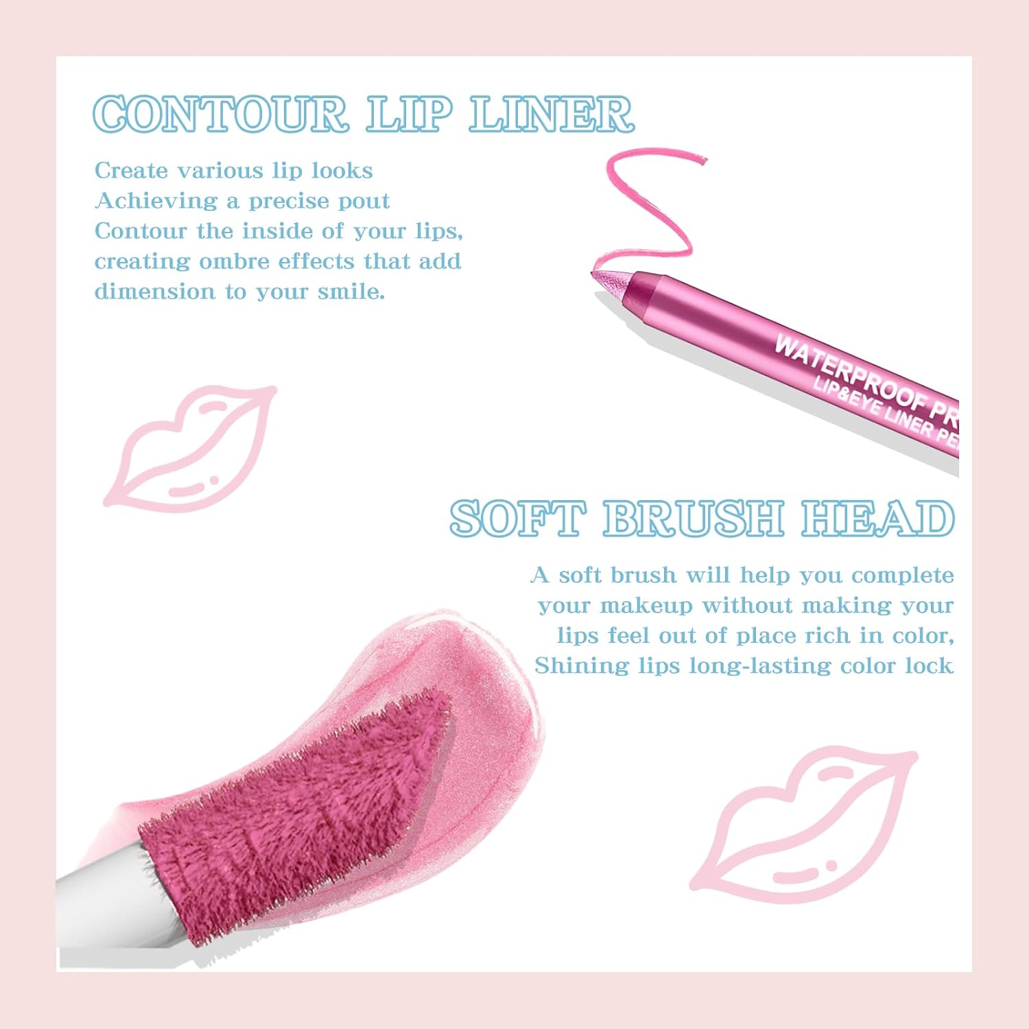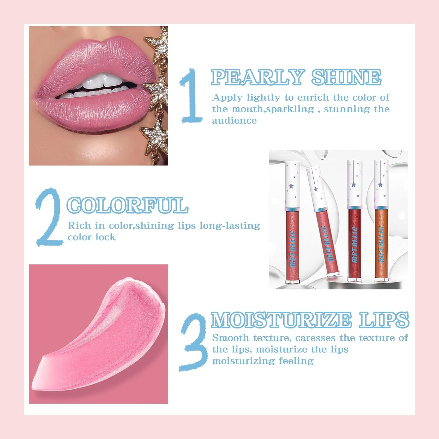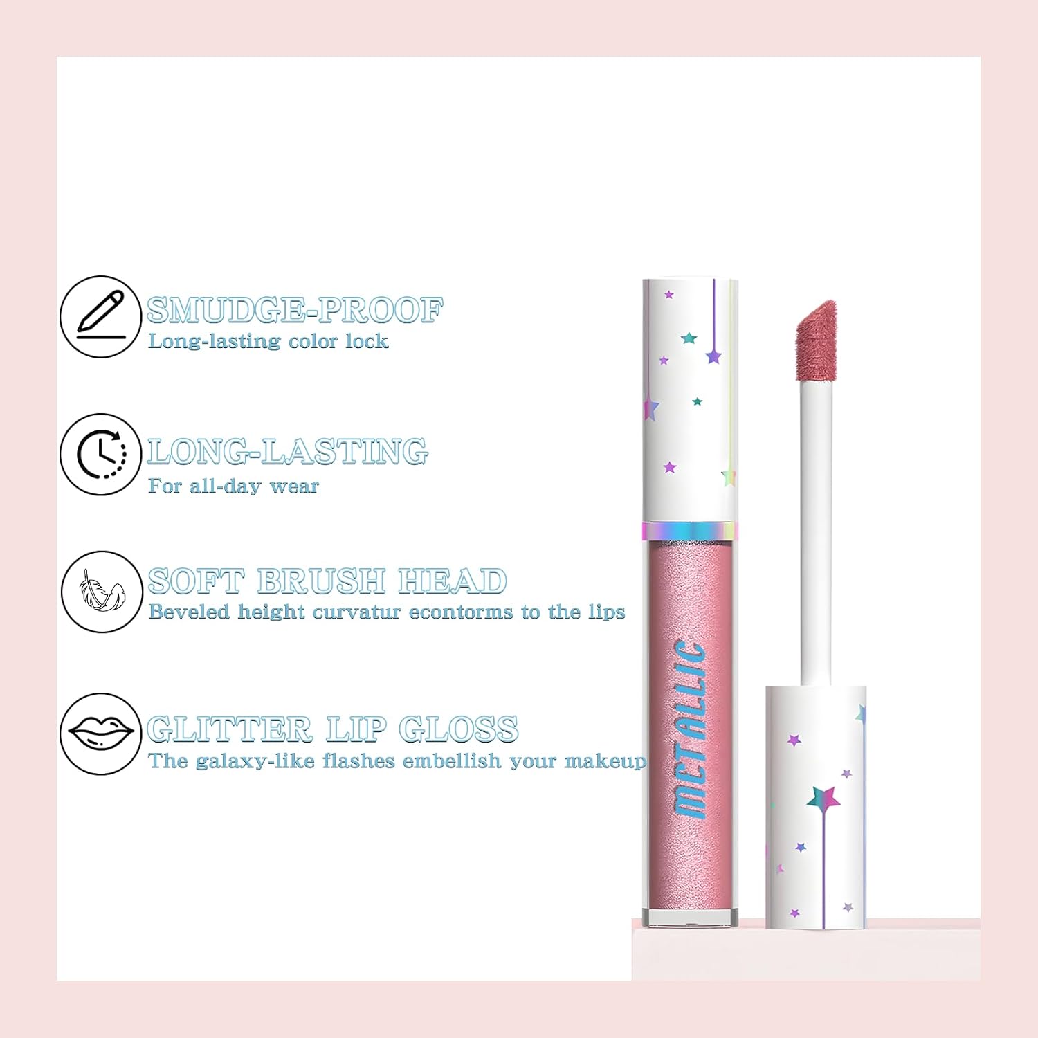 Metallic Liquid Lipstick and Lip Liner Set, Shimmer Long Lasting Lip Gloss Stick, Glitter Non Stick Cup Pink Lip Color, Transfer Proof Full-Coverage Pearl Diamonds Shinning Makeup for Women