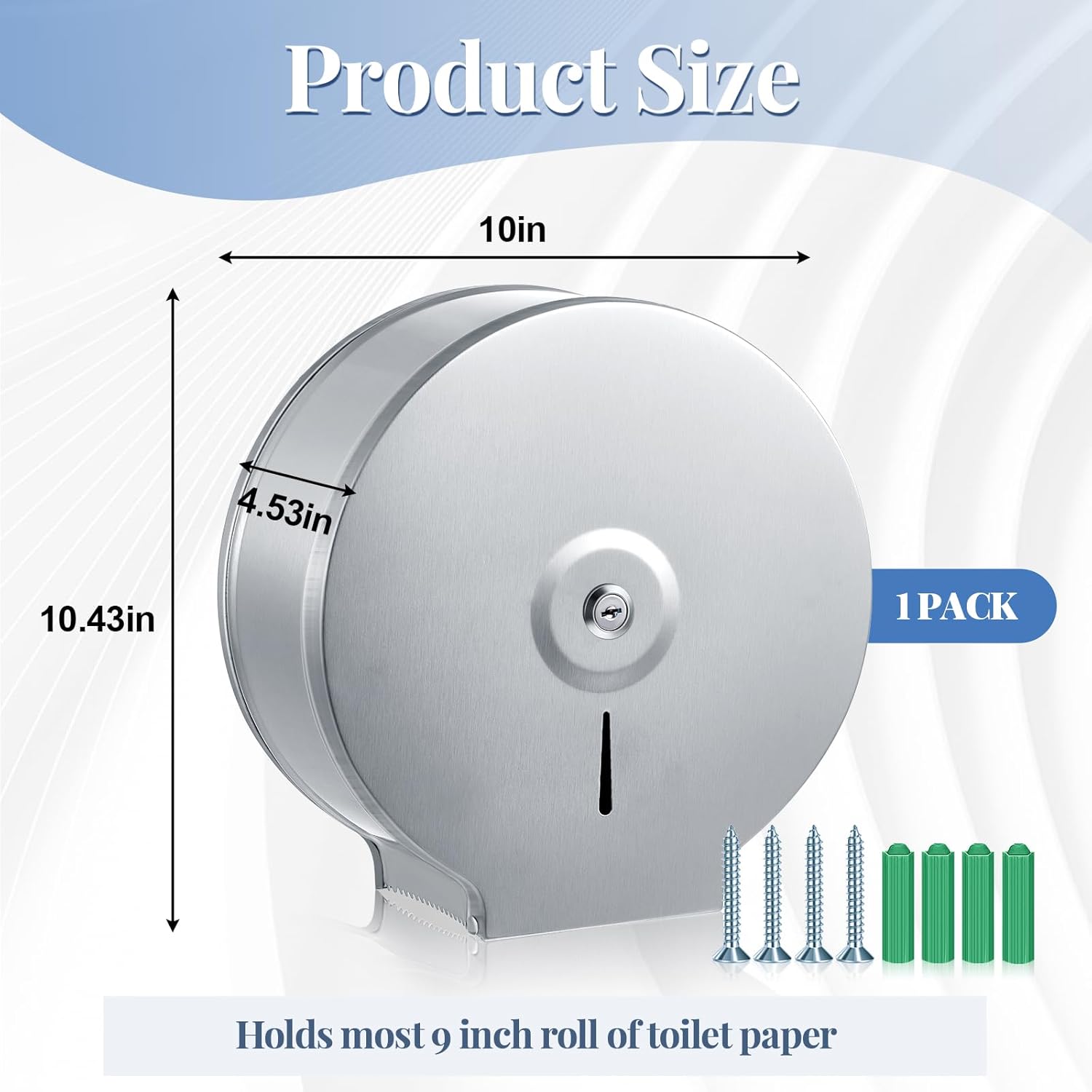Large Capacity: the package contains 1 piece of jumbo toilet paper dispenser with locks and keys, each measures about 10.43 x 10 x 4.53 inches/ 26.5 x 25.4 x 11.5 cm, can easily fit 9 inch roll papers, which ensures an uninterrupted supply, minimizing frequent refills