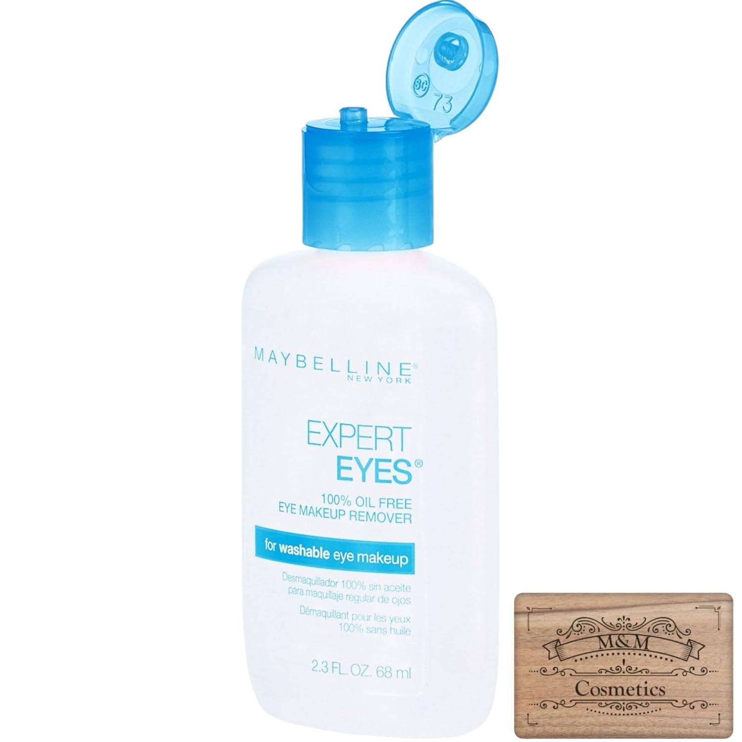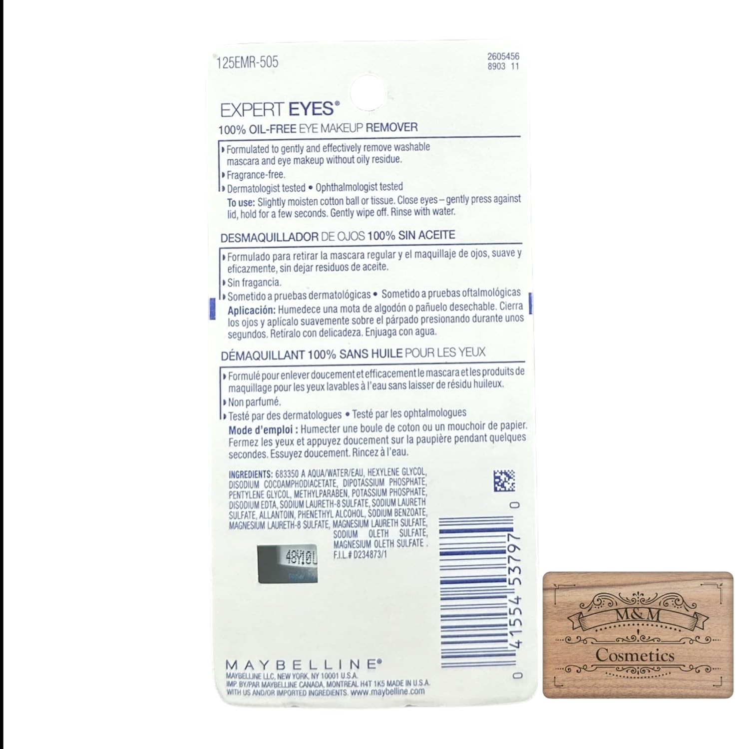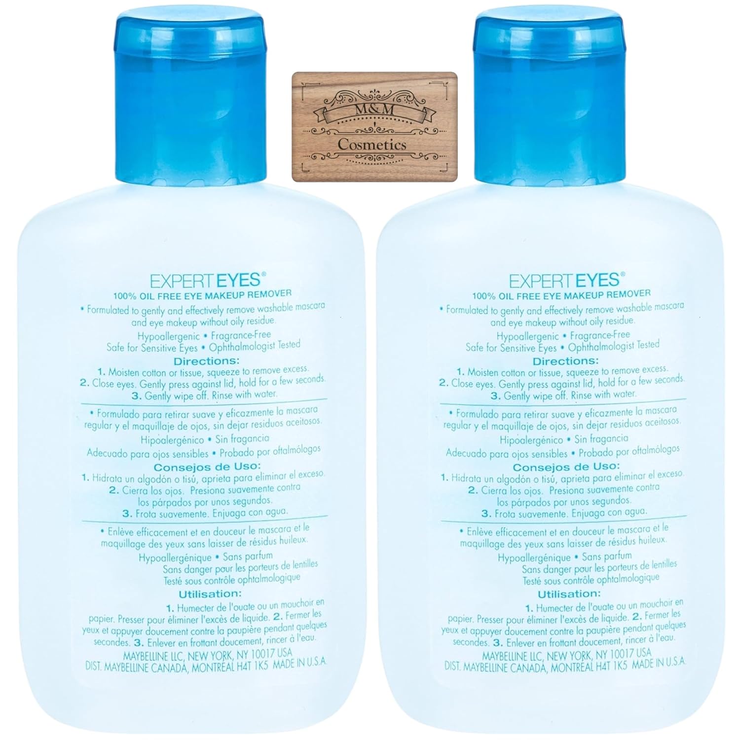 This bundle comprises 2 units of Maybelline Expert Eyes Oil-Free Eye Makeup Remover, tailored for washable eye makeup, each containing 2.3 fluid ounces, along with an M&M Cosmetics sticker.