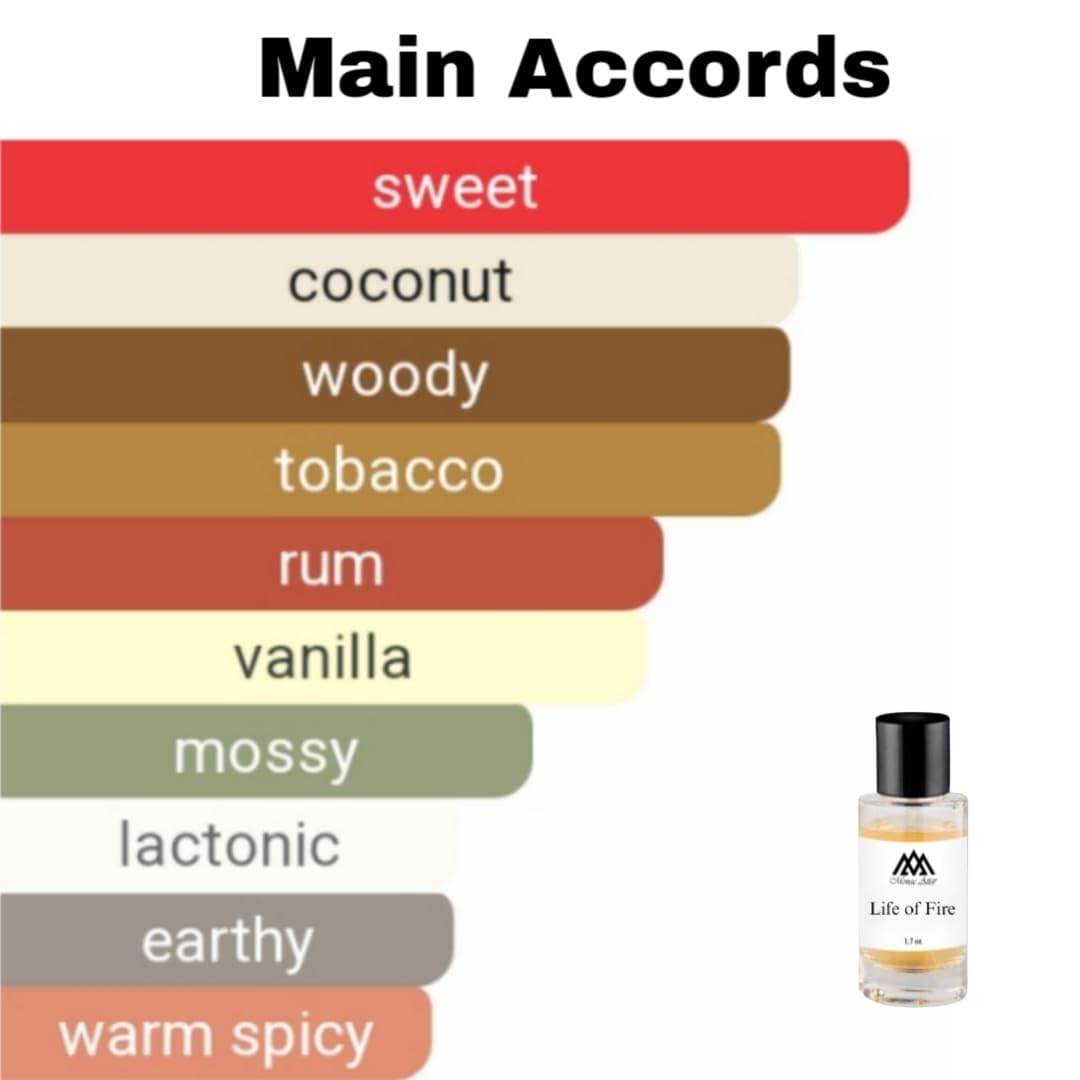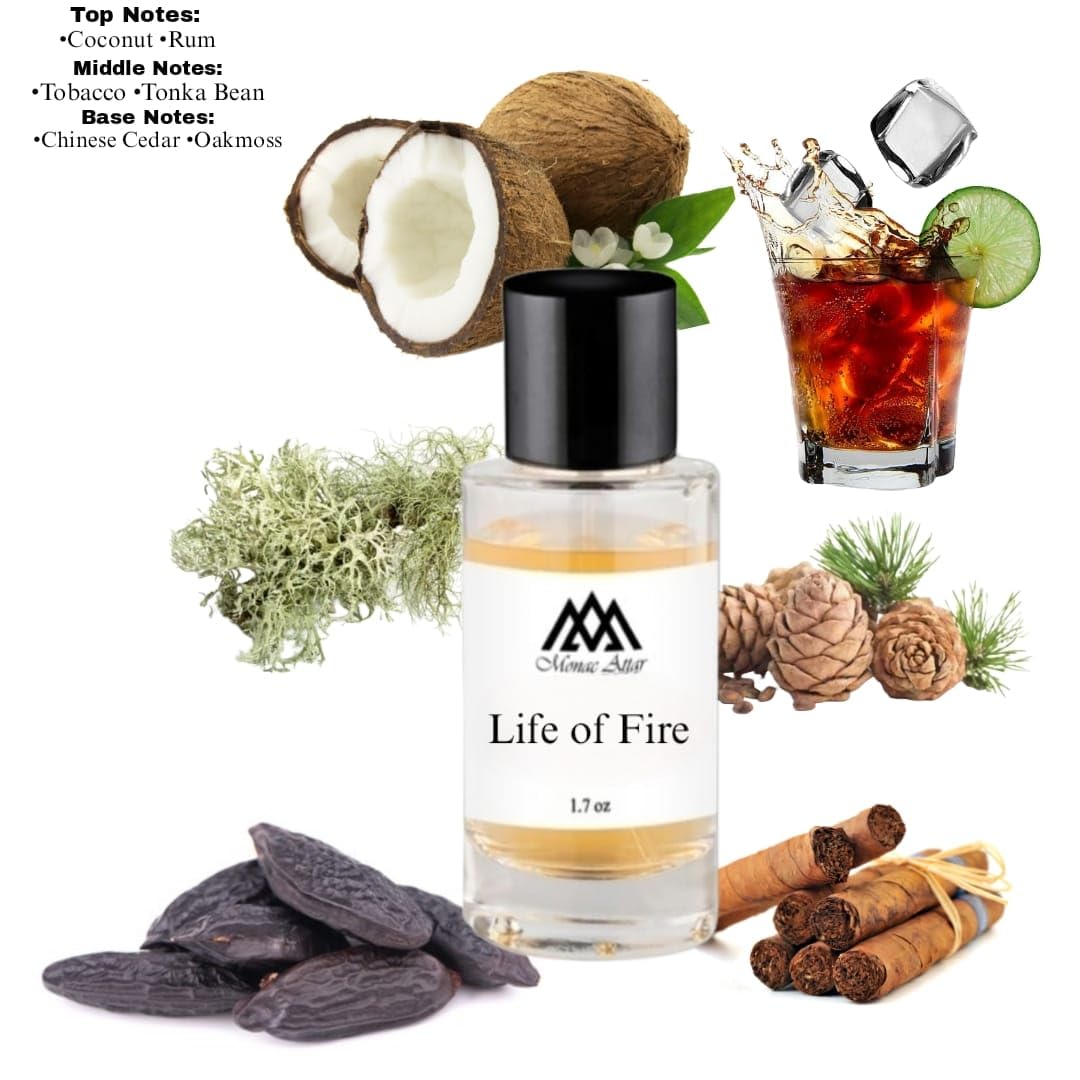 Life Of Fire is a woody, gourmand, and boozy fragrance with top notes of coconut and rum, heart notes of tobacco and tonka bean, and base notes of oakmoss and Chinese cedarwood. It’s described as seductive and lively, with a style of woody amber. Some say it’s a manly scent, while others say it’s sweet in the middle and has a woody vibe NOTES : Top notes are Coconut and Rum; middle notes are Tobacco and Tonka Bean; base notes are Chinese Cedar and Oakmoss.