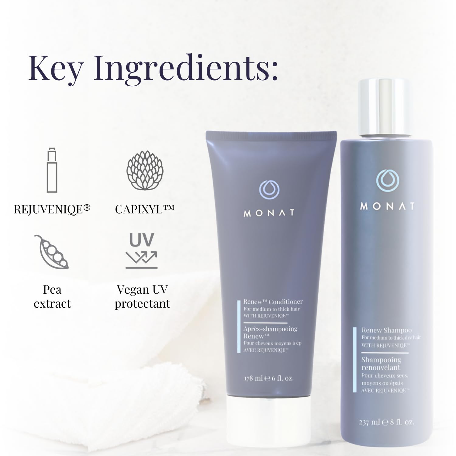 MONAT Renew Duo Infused with the exclusive REJUVENIQUE Oil, a blend of more than 13 natural plants and essential oils, the duo offers a rich source of omega fatty acids, antioxidants, and nutrients, fostering an environment for your hair to thrive in its natural beauty. The addition of CAPIXYL aids in protecting the scalp and enhancing the natural strength and shine of your hair.