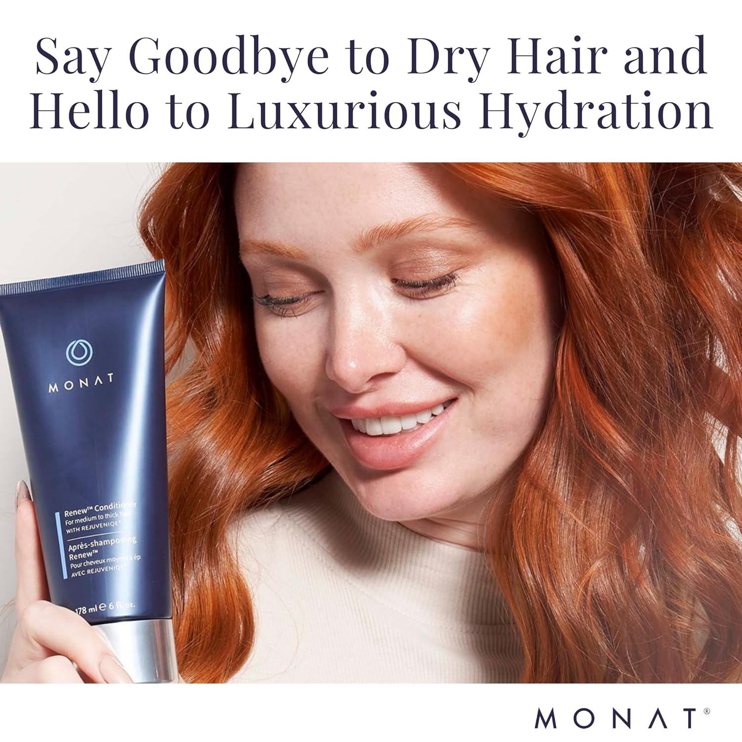 Experience the synergistic benefits of MONAT Renew Shampoo and Conditioner, designed to deeply moisturize and revitalize all hair types for a luscious, healthy look.