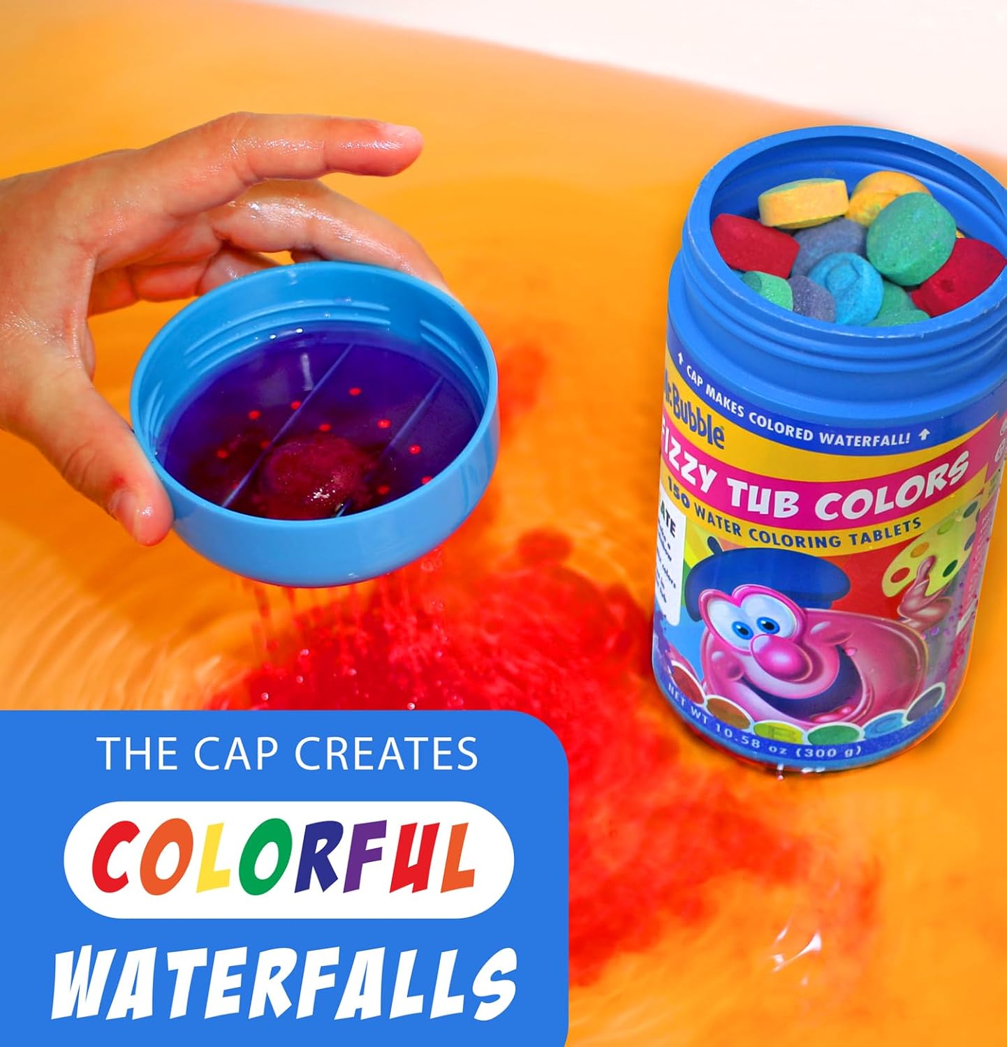 Mr. Bubble Fizzy Tub Colors Bath Water Coloring Tabelets, 6 Bright Colors, Red, Orange, Yellow, Purple, Blue and Green, Fragrance Free, Cap Makes Colorful Waterfall (3 Jars, 150 Tablets Each)