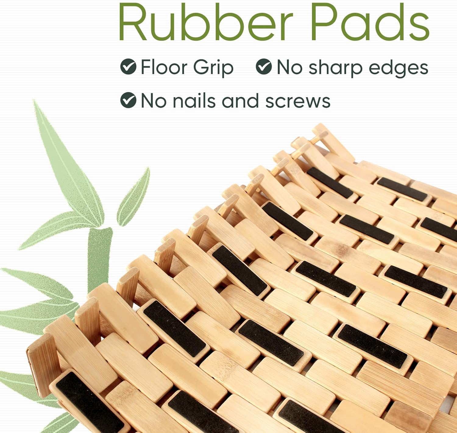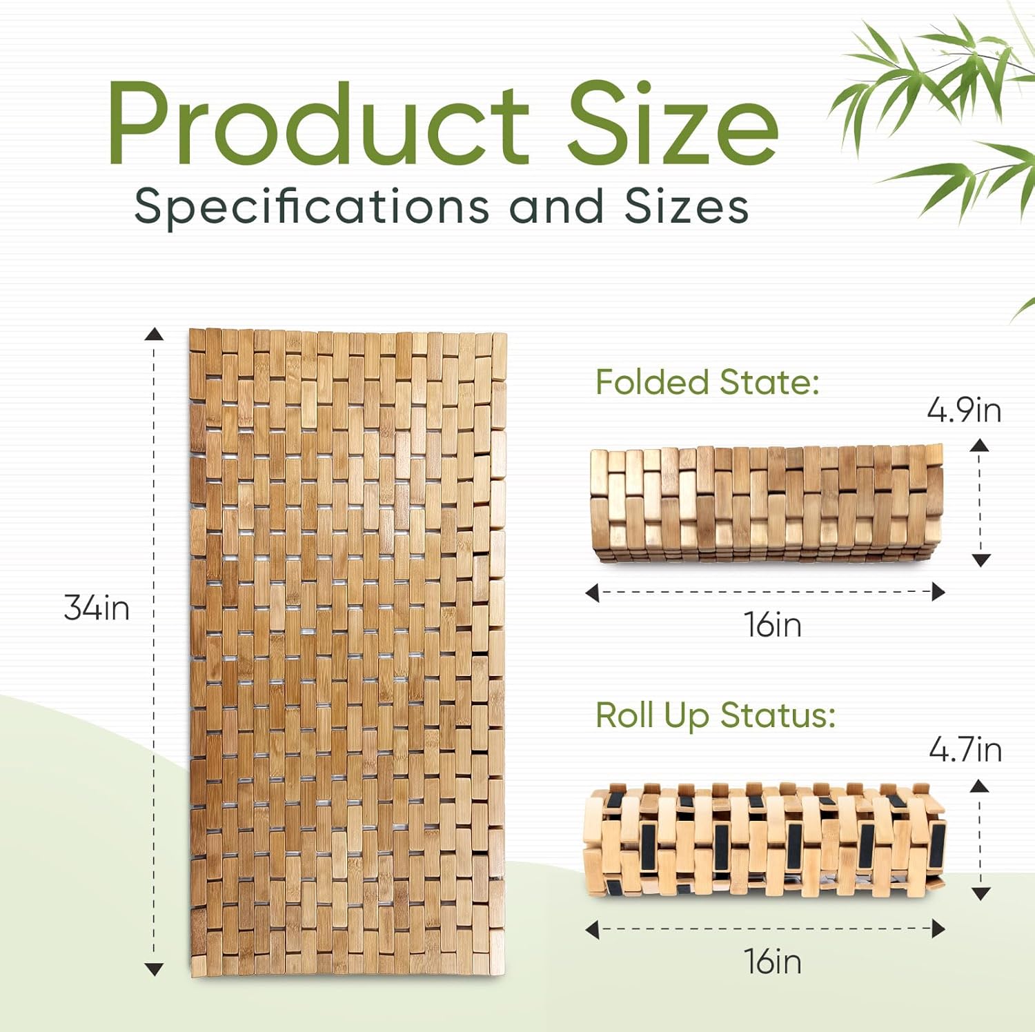 🎋【Space Saving】 This bath mat bamboo measures 16 inches x 34 inches, which is the right size and lightweight. It can be rolled up or folded and won’t take up much storage space.