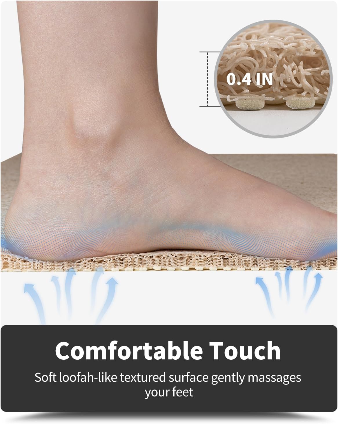 Comfort Shower: Soft loofah-like textured surface of ideal thickness makes this shower rug comfortable for your shower in bare feet. Besides cutting the cold hard floor off from your body and providing a warm support, it also gently massages and exfoliates your skin.