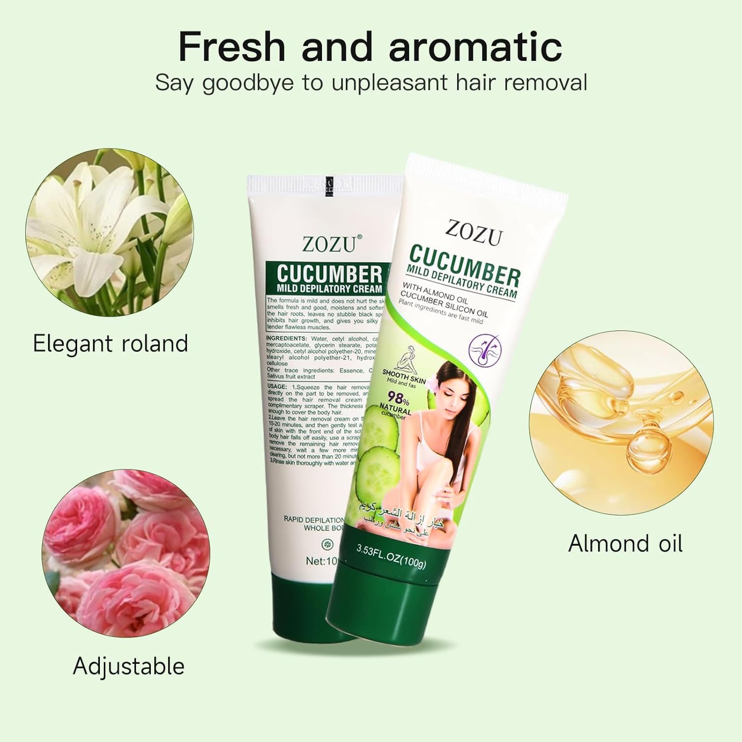 【Safe Ingredients】: The main ingredient of hair removal cream is extracted from the whole nutritional essence of cucumber and a variety of plant flowers, which is mild and non-irritating, and a cucumber can only extract the nutrients of 3 boxes of hair removal cream.