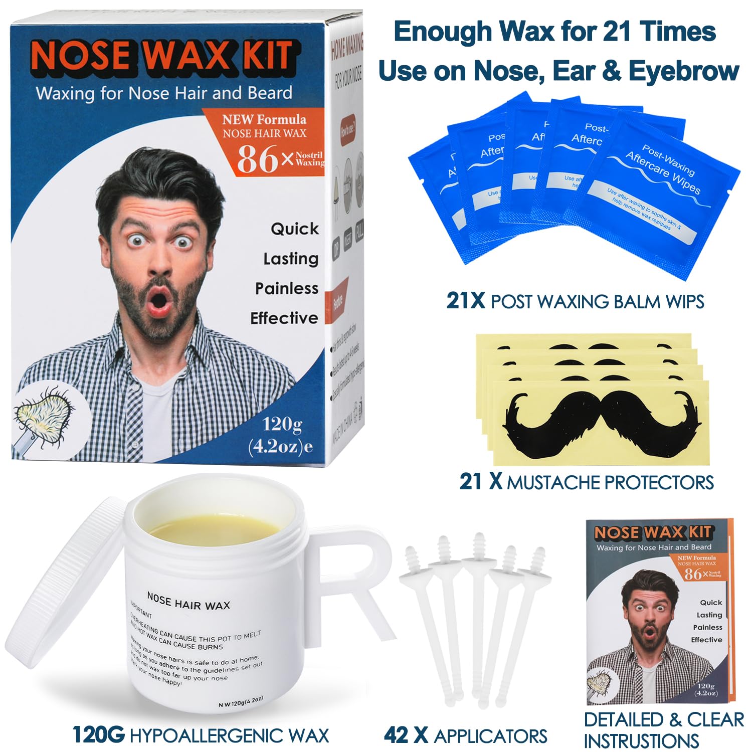 Nose Wax Kit, Best Value 120g Nose Hair Waxing Kit for Men With 42 Nose Wax Sticks, Hypoallergenic Home Waxing Kit for Women Men 21 Post Waxing Balm Wipes, 21 Mustache Guards, Nose and Ear Wax Kit Men