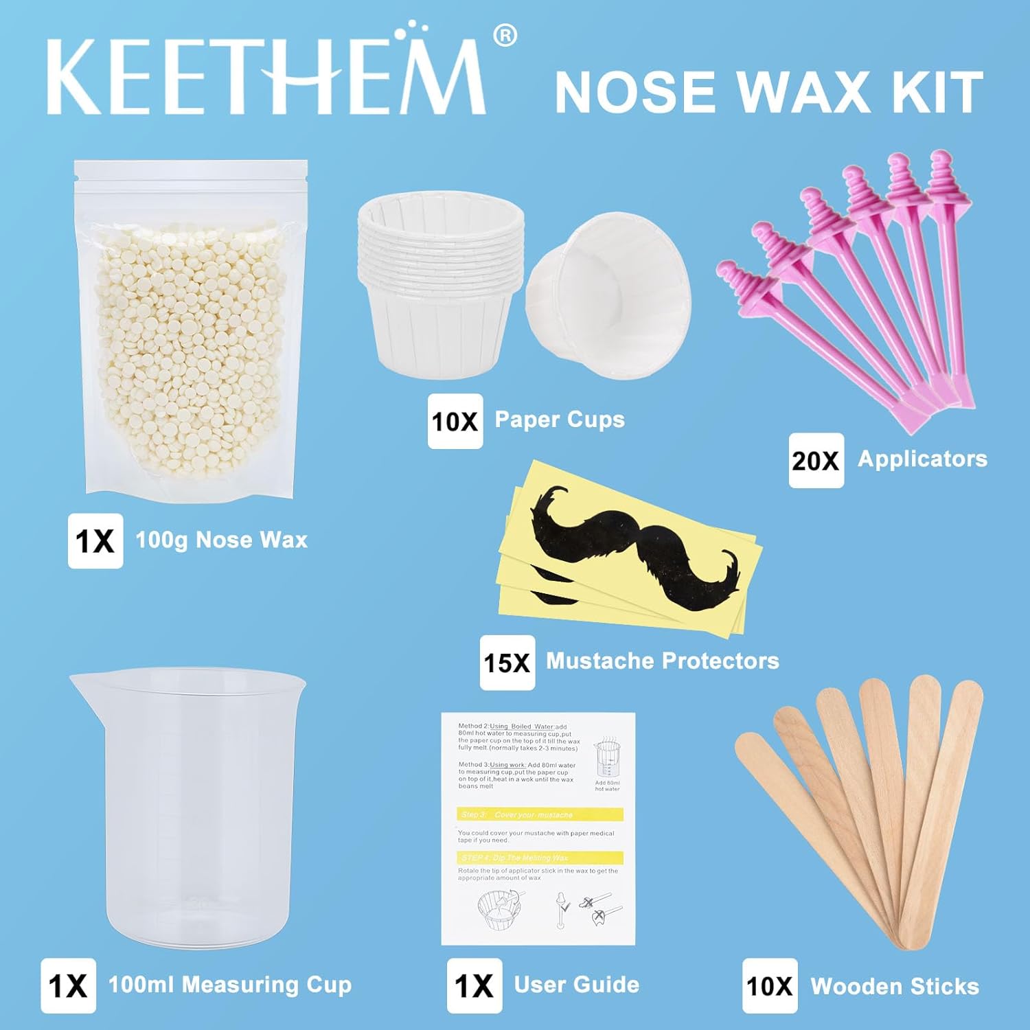EASY-TO-USE AND LONG-LASTING: Our nose wax kit removes unwanted nose hair conveniently. Simply melt 5 grams of nose wax in the paper cup with 20mL of water in the measuring cup using a microwave for 60-90 seconds or 2-3 minutes with 80mL of boiled water. Then, dip and rotate the applicator in the melted wax, apply it inside your nostrils, and pull to remove hair from the root. With regular use, our nose wax slows down hair growth and leaves your nose neat and clean for up to 4 weeks.