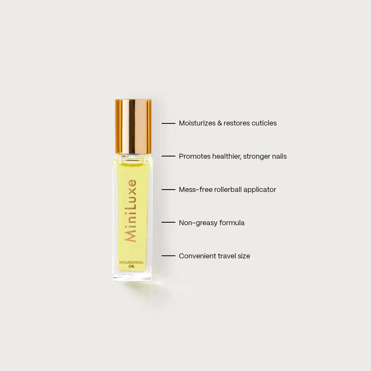 MiniLuxe Nourishing Cuticle Oil helps to prolong manicures with an all-natural formula of oils that strengthens nails and softens cuticles. Formulated with a non-greasy, emollient texture, and scented with a light, invigorating scent of lavender and lemon.