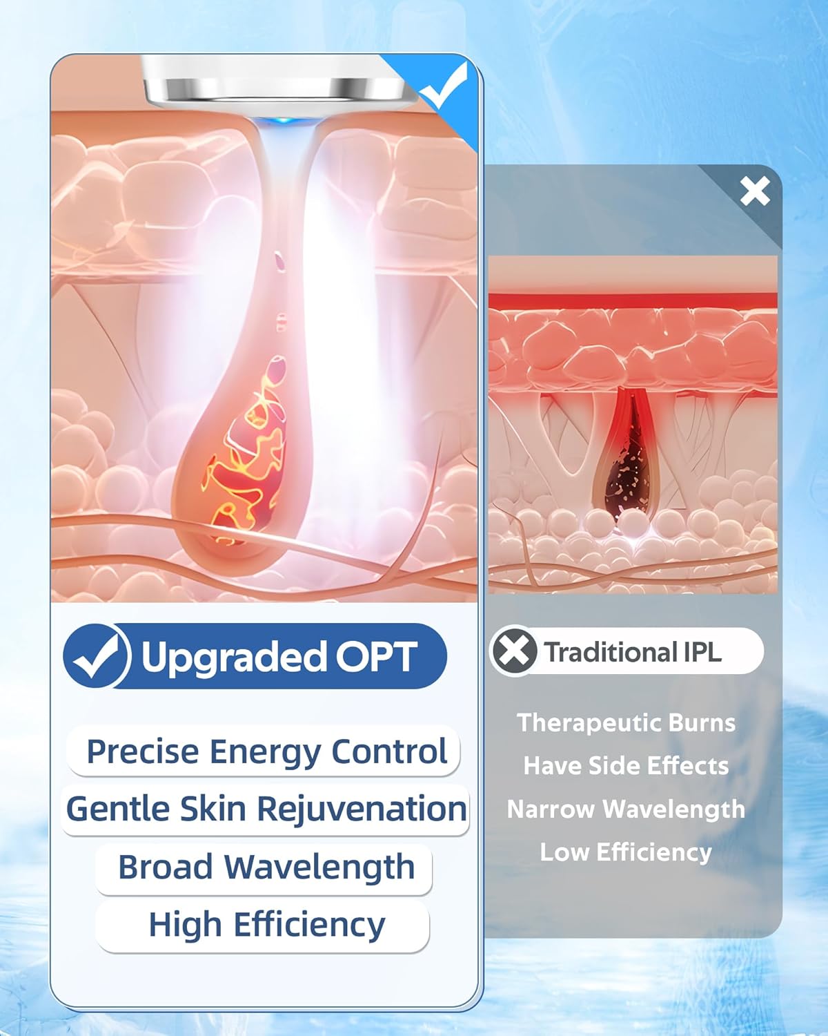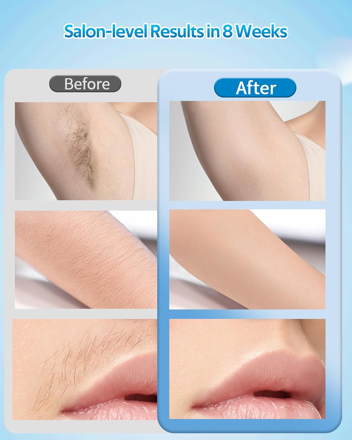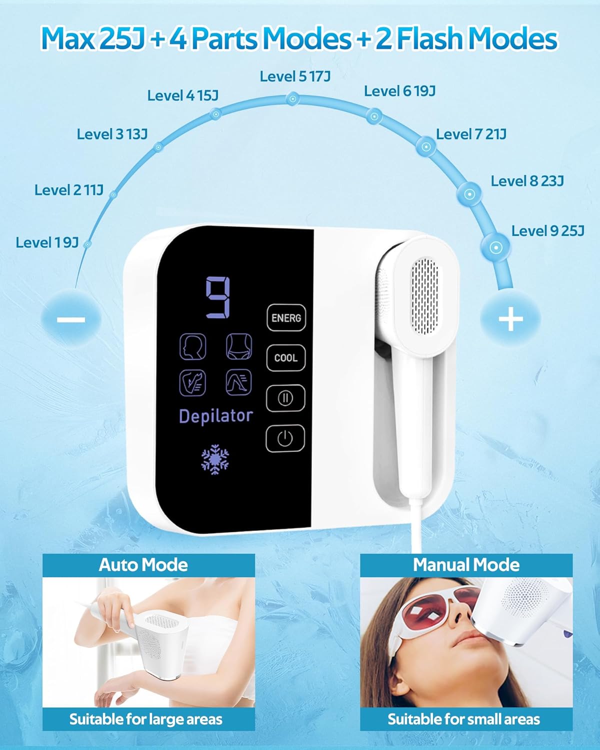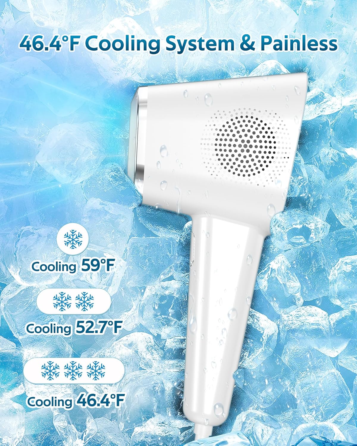 🌟【Cooling System & Painless】Using clinical-grade sapphire ice-touch technology with bipolar quartz lamp tubes to create a deep, continuous cooling effect, coupled with leading skin sensing technology to minimize skin damage and cool the temperature can be as low as 46.4℉ (8℃). Offers three adjustable cooling intensities to suit your needs, ensuring a painless, refreshing hair removal experience.