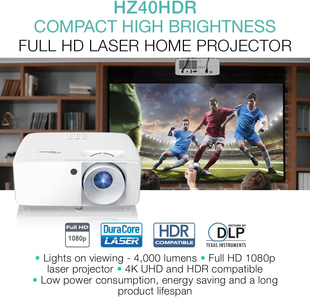 Optoma HZ40HDR Compact Long Throw Laser Home Theater and Gaming Projector, 1080p HD with 4K HDR Input, High Bright 4,000 Lumens