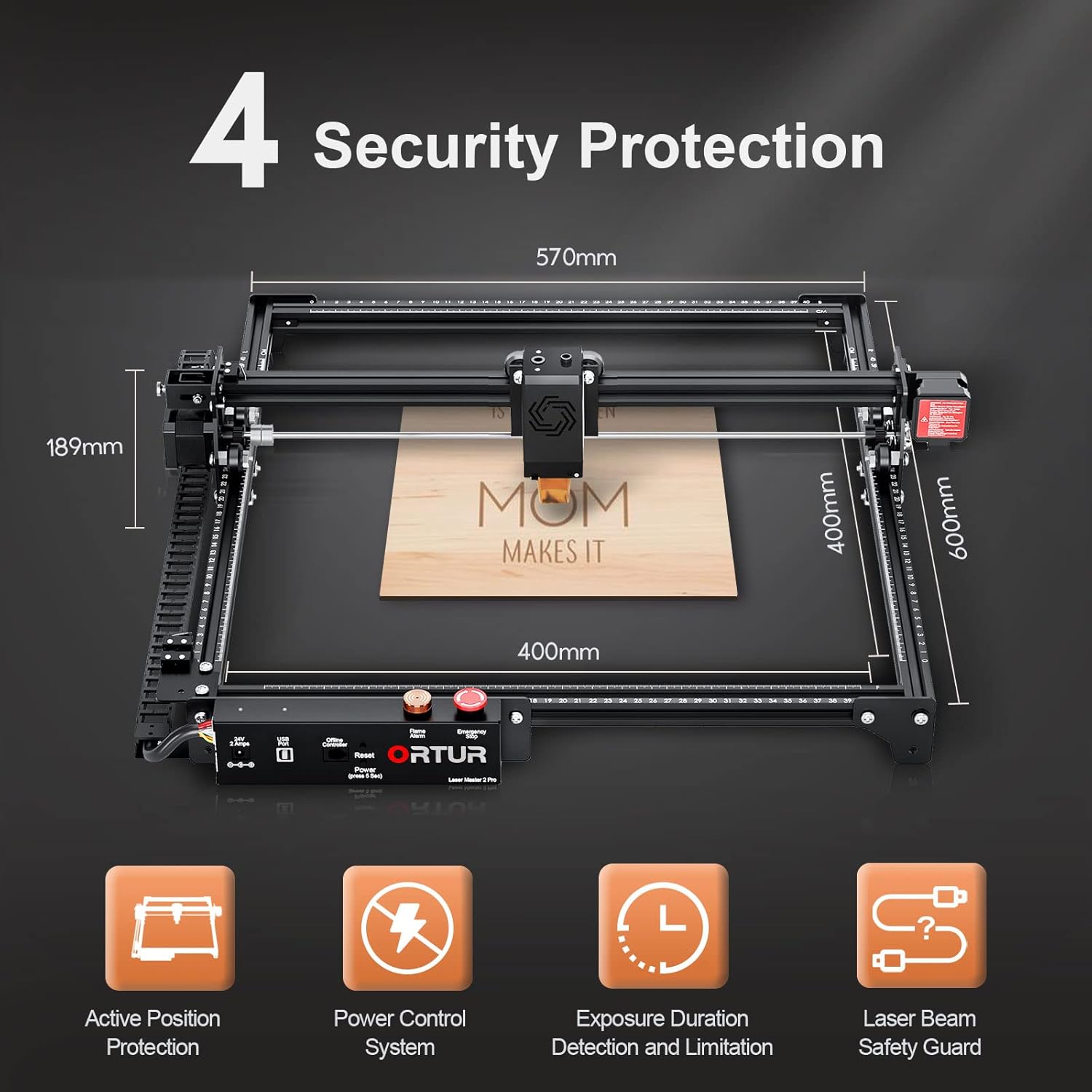 Laser Engraver with 5 Safety protections – ORTUR Laser Master 2 Pro S2 LU2-10A has 5 safety protections. 1. When the engraving machine is displaced or tilted, it will automatically stop the laser; 2. When the engraving machine or computer crashes, the laser will stop working immediately. 3. The engraving machine is turned on, but there is no movement for a long time, the laser will be turned off automatically. 4. Flame Detector + Buzzer Alarm 5. Emergency stop switch for an emergency.