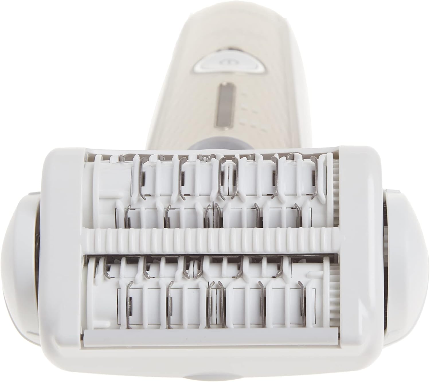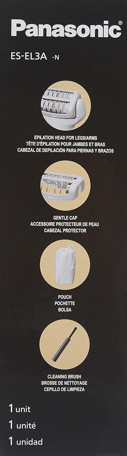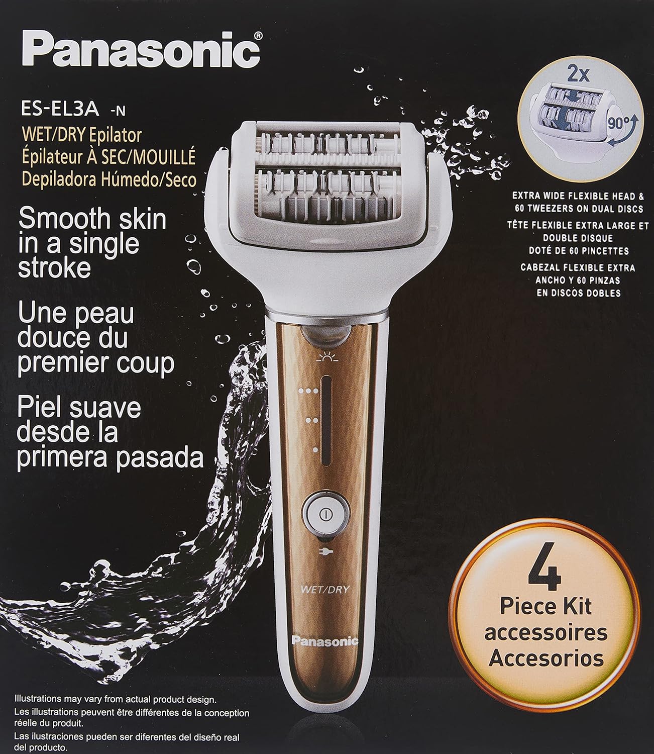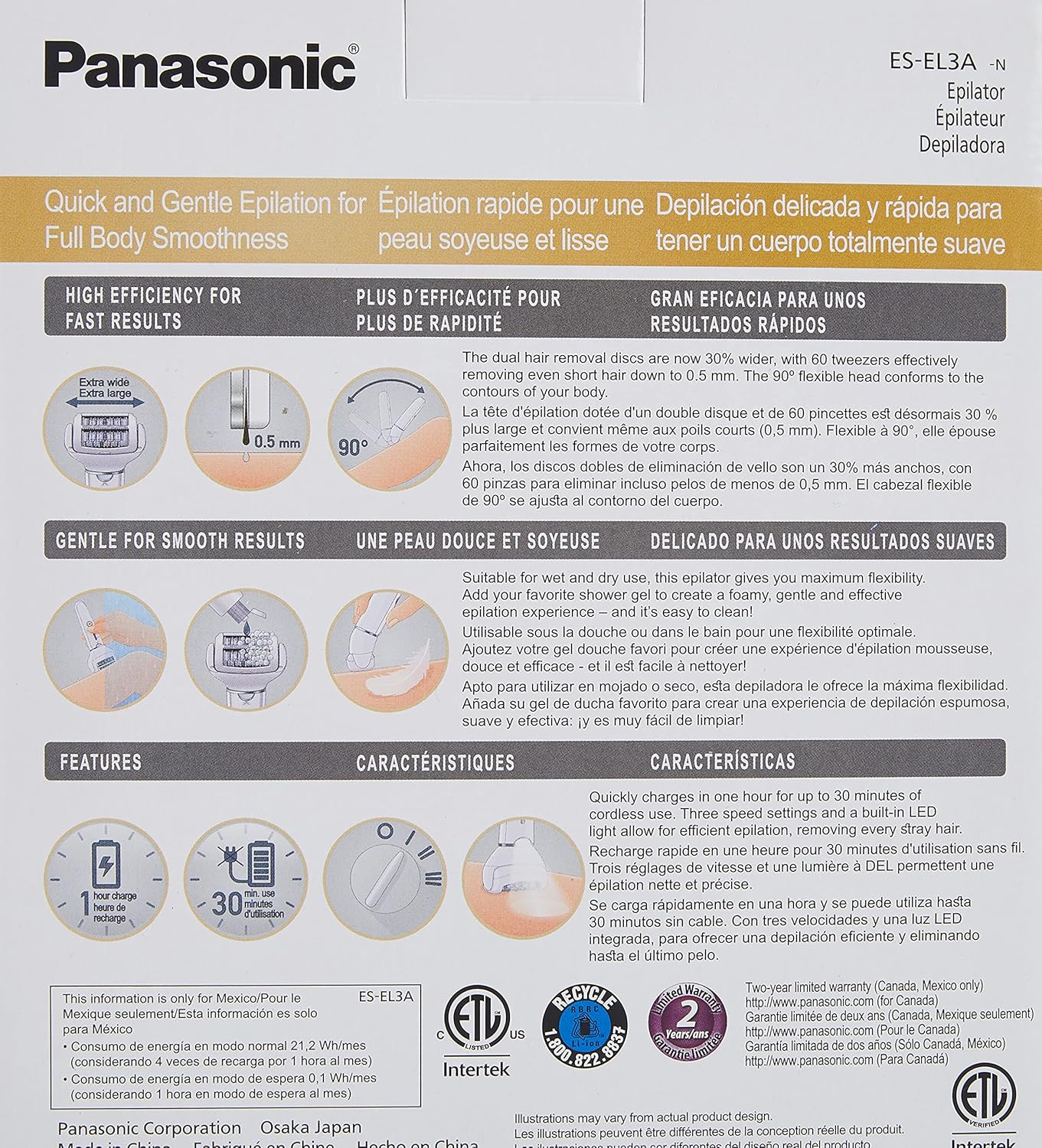 Panasonic ESEL3A gentle wet/dry epilator, features a wide 32.4mm area and rotating double discs with 60 hypoallergenic tweezers and flexible 90 Degree pivoting head.