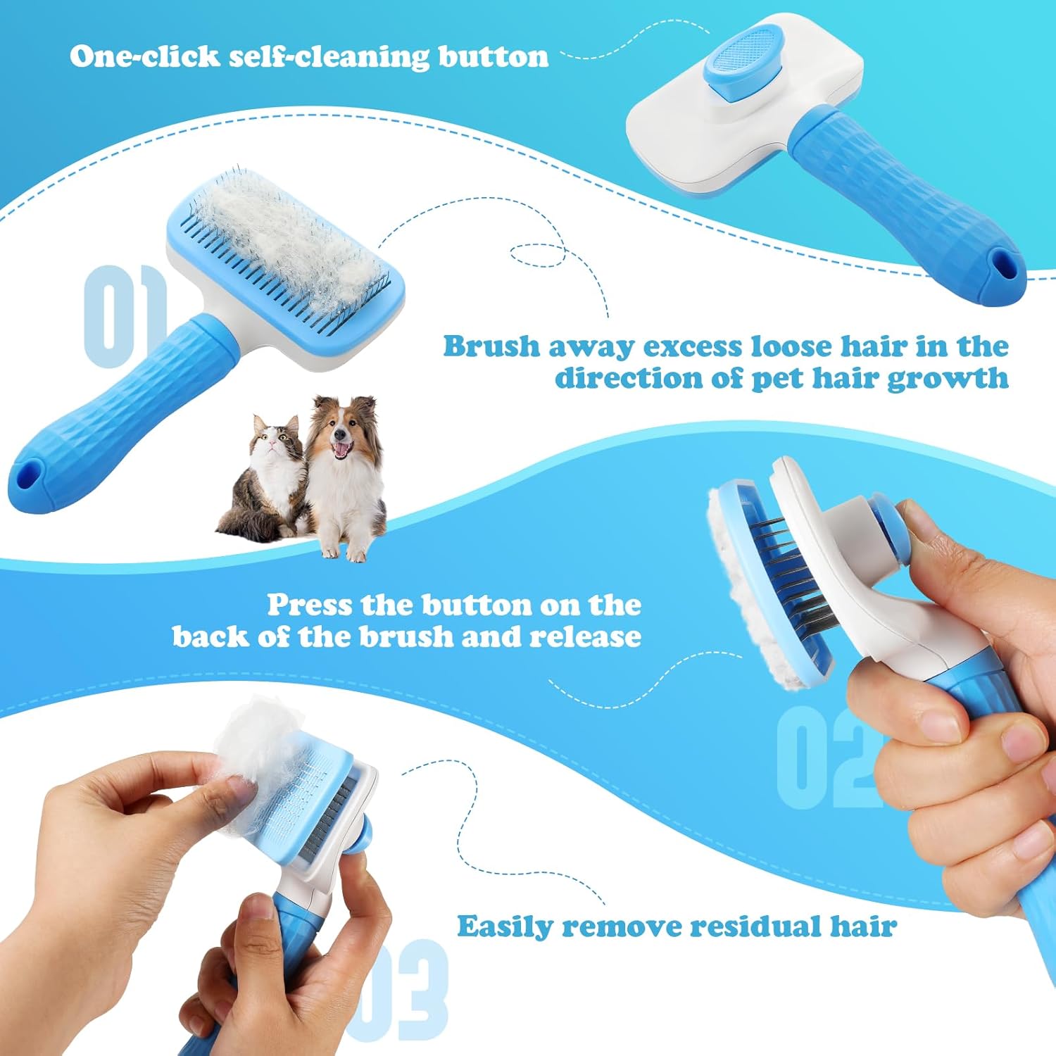 ONE-BUTTON SELF-CLEANING DESIGN:cat Brush with release button,With the self-cleaning button design, when you finish combing your pet’s hair, press the button on the back of the brush to remove the remaining hair on the brush.