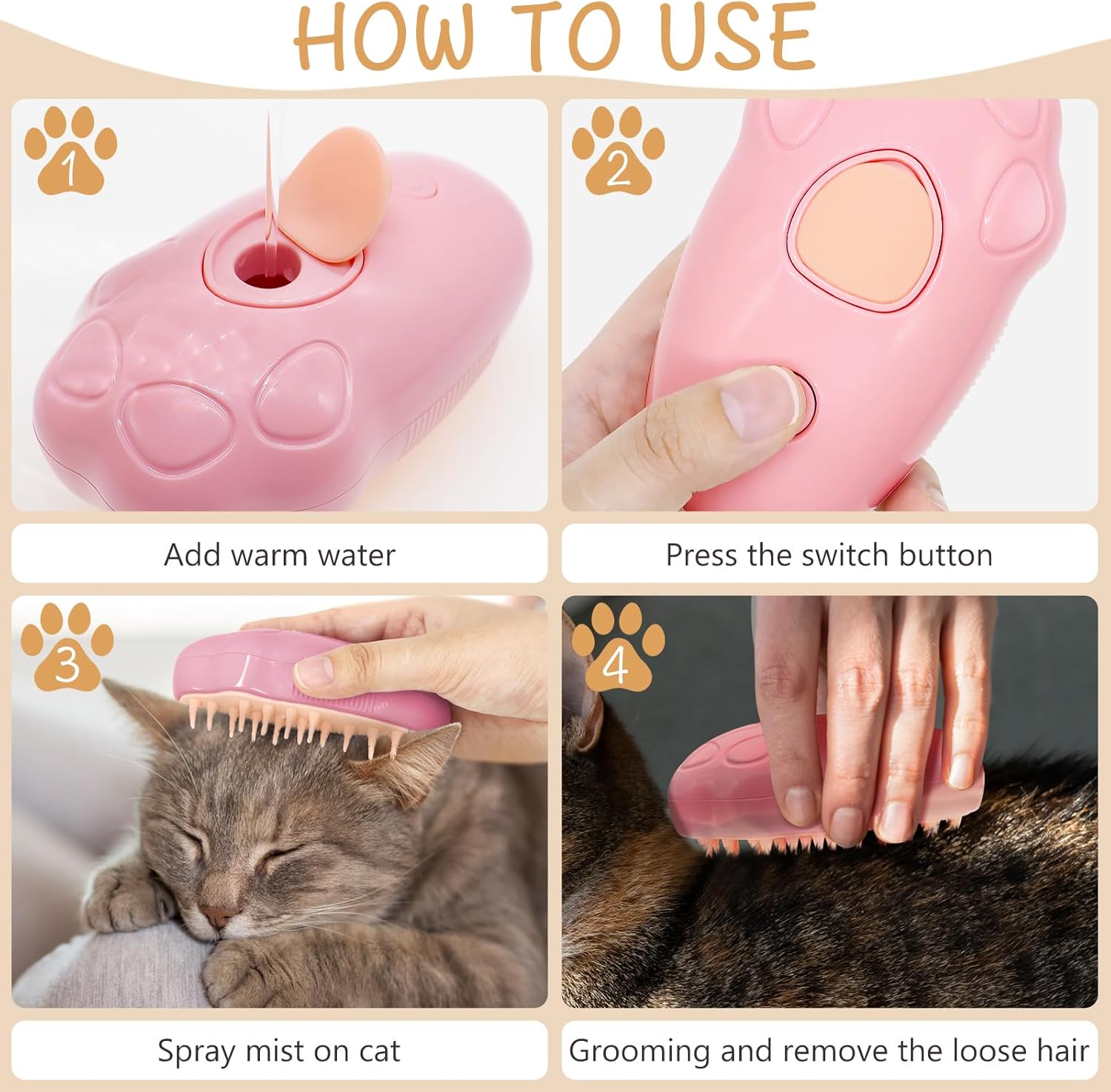 🐾【New Design】Our cat steam brush adopted a cat claw design, which is cute and fits the hand perfectly. It is made of ABS + silicone and has soft round silicone bristles on the tip, which are comfortable and will not harm your pet’s skin.