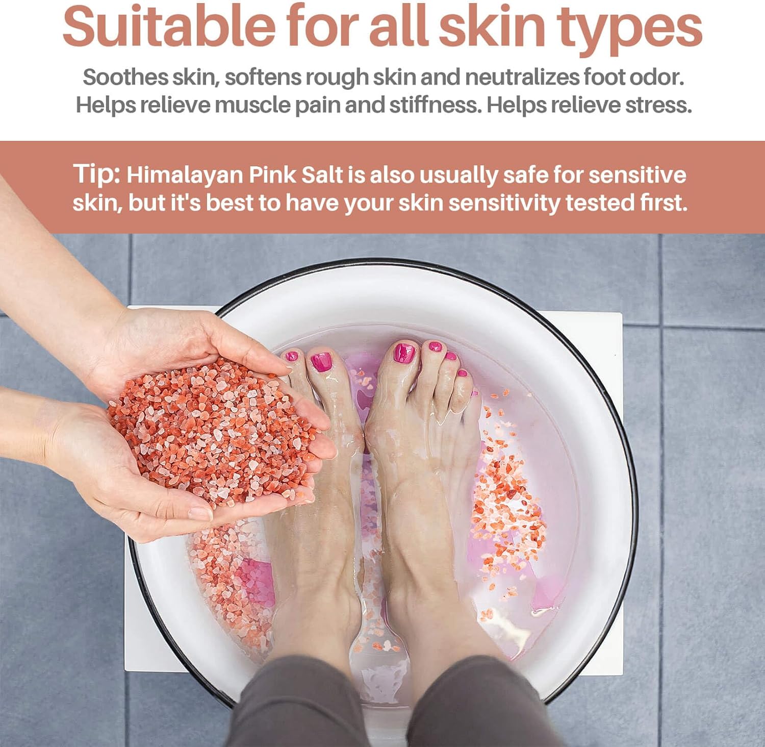 All natural】Harvested from ancient salt deposits in the Himalayan mountains.Pink himalayan bath salts rich in minerals and trace elements, making it perfect for creating a luxurious and soothing bathing experience. Pink bath salt revitalizes the skin, leaving it soft, smooth, and radiant. Suitable for daily skincare routines, bath pink salt can be used for skin, face, hair, hand, and foot care. Foot soaking salt is an ideal choice for those seeking a spa-like experience at home.