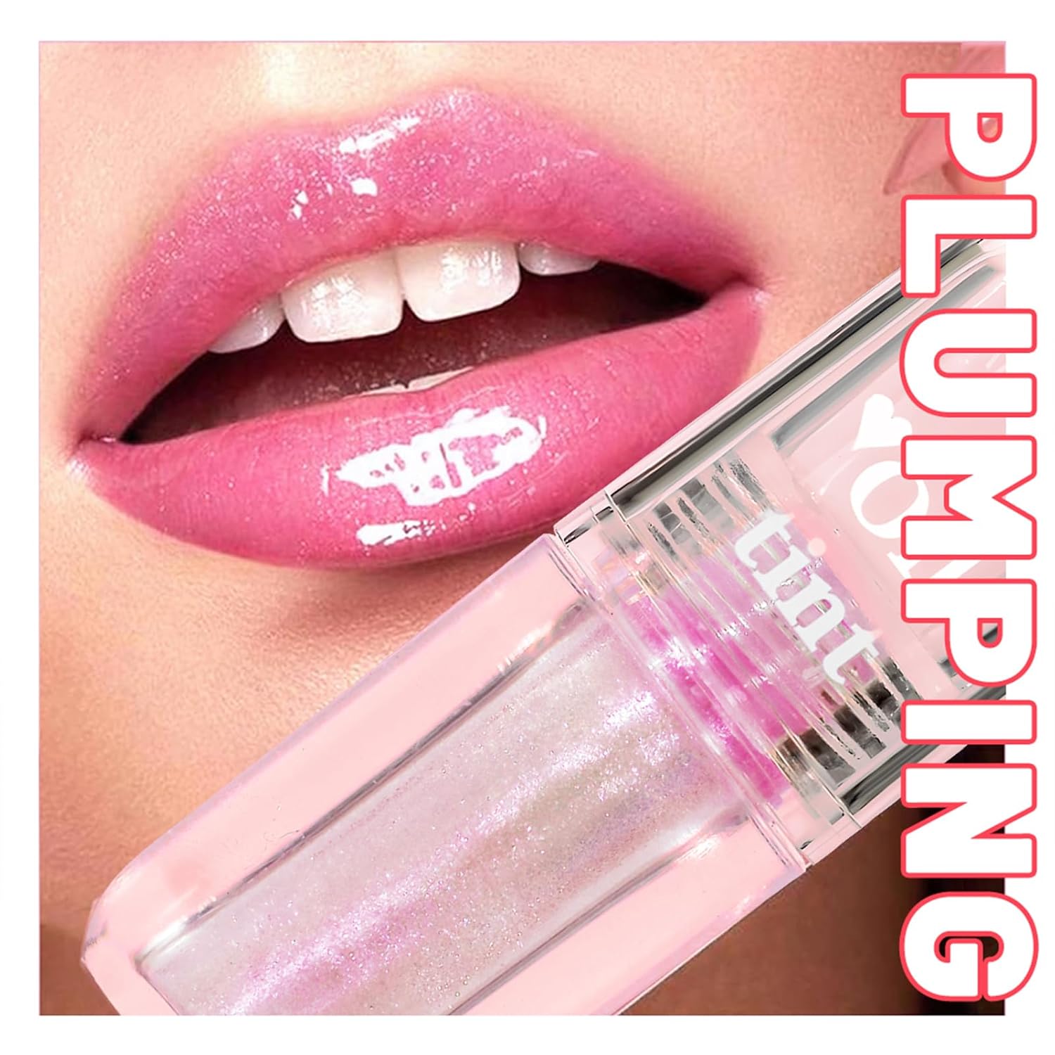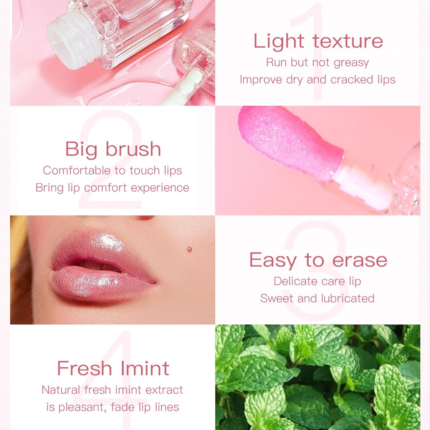 【Hydrating Lip Oil Tint】Plumping glitter lip oil tint, big brush head hydrating tinted lip balm, Includes 4 colors: transparent, pearlescent transparent, transparent color changing, pink shimmer color changing, giving them a silky touch and shine.
