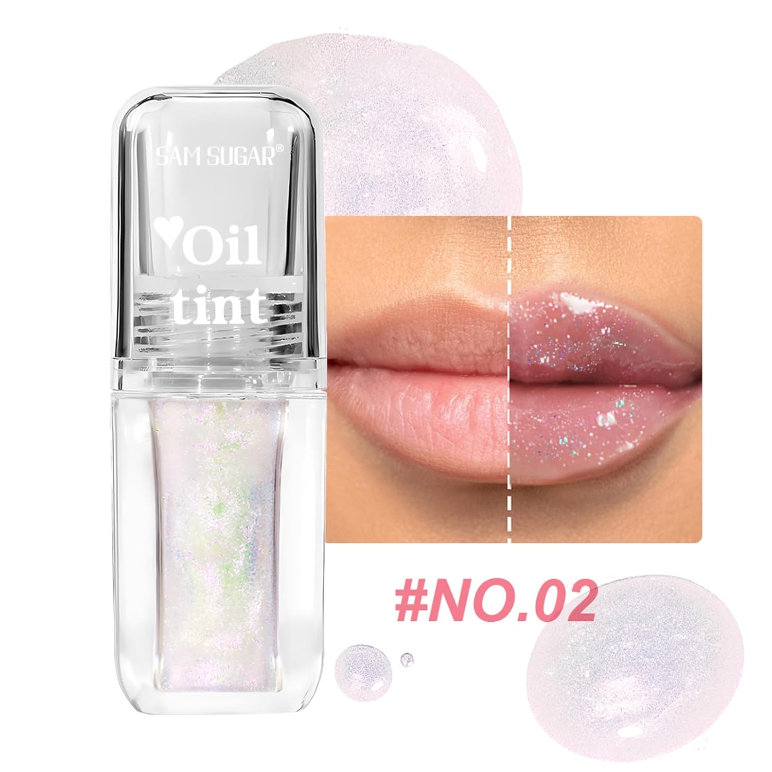 Plumping Glitter Lip Oil Tint, Big Brush Head Hydrating Tinted Lip Balm, Clear Glitter Lip Gloss Lip Care Shimmery Lip Oil, Glossy Lip Glow Oil Long Lasting Nourishing & Non-sticky Lip Tint (02#, 4ml)