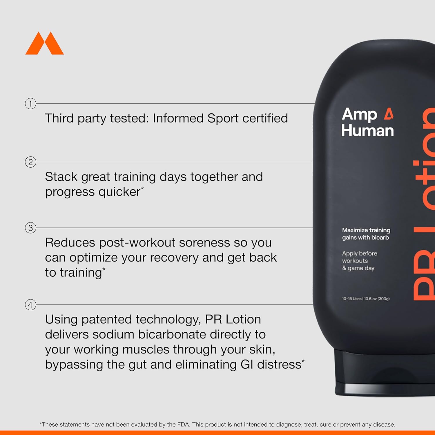 Patented Technology – PR Lotion is the world’s first and only lotion that delivers the natural electrolyte sodium bicarbonate to your working muscles directly via your skin using patented technology developed by Amp Human.