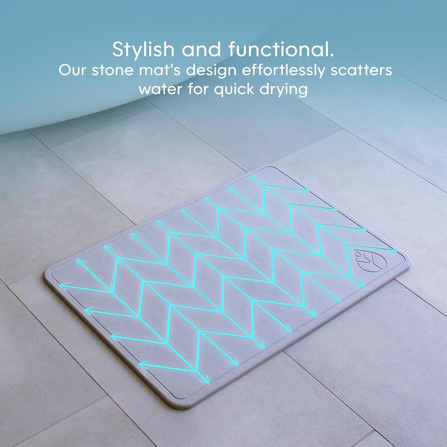 DESIGNED TO DRY FAST: Our specially designed bathroom stone mat uses a geometric pattern that helps effortlessly scatter water for effective quick drying that you can see instantly. Say goodbye to the soggy mats and wet floors with this efficient and functional quick dry stone bath mat.