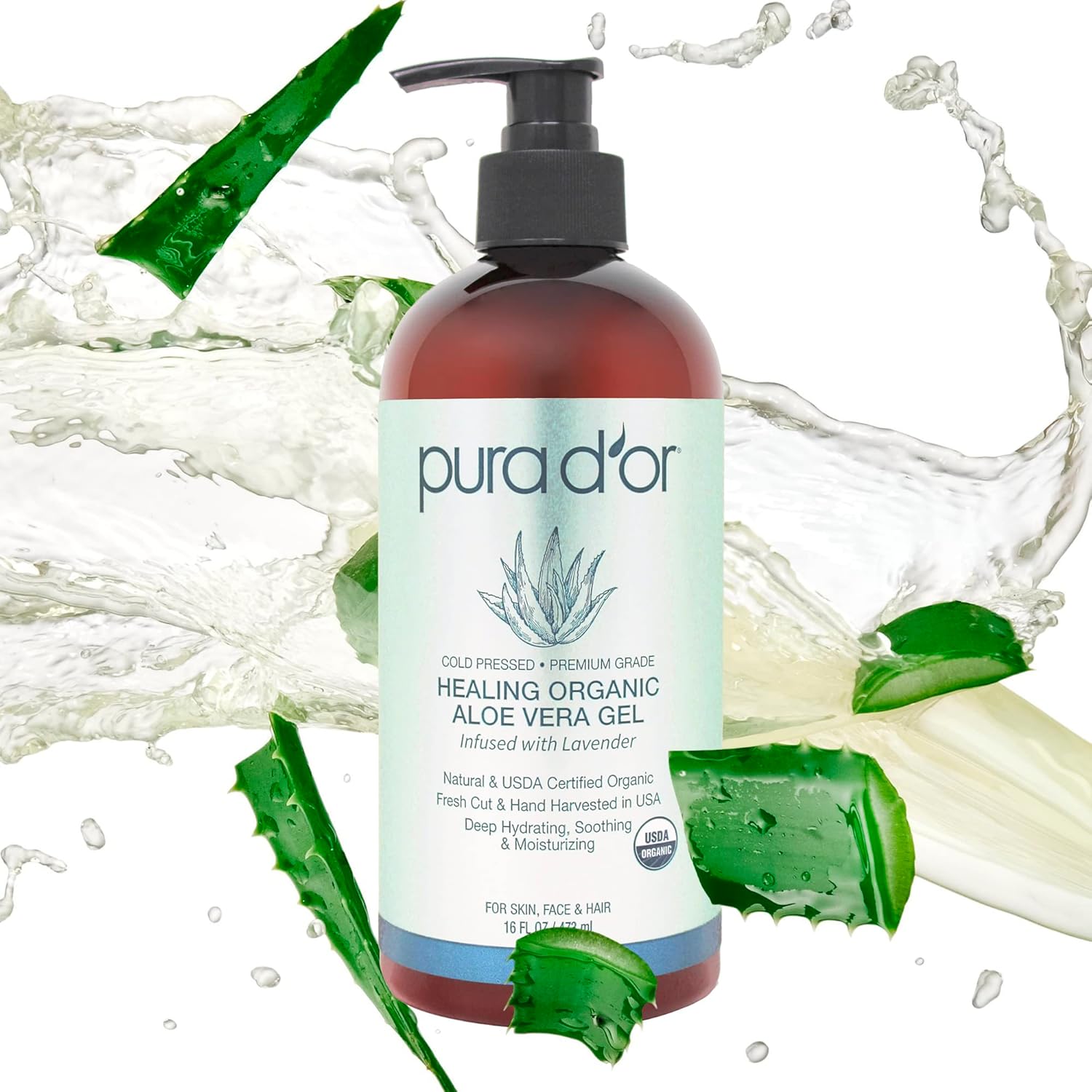 PURA D’OR 16 Oz ORGANIC Aloe Vera Gel – Lavender – All Natural – ZERO Artificial Preservatives – Deeply Hydrating & Moisturizing – Sunburn, Bug Bites, Rashes, Small Cuts, Eczema Relief – Skin & Hair