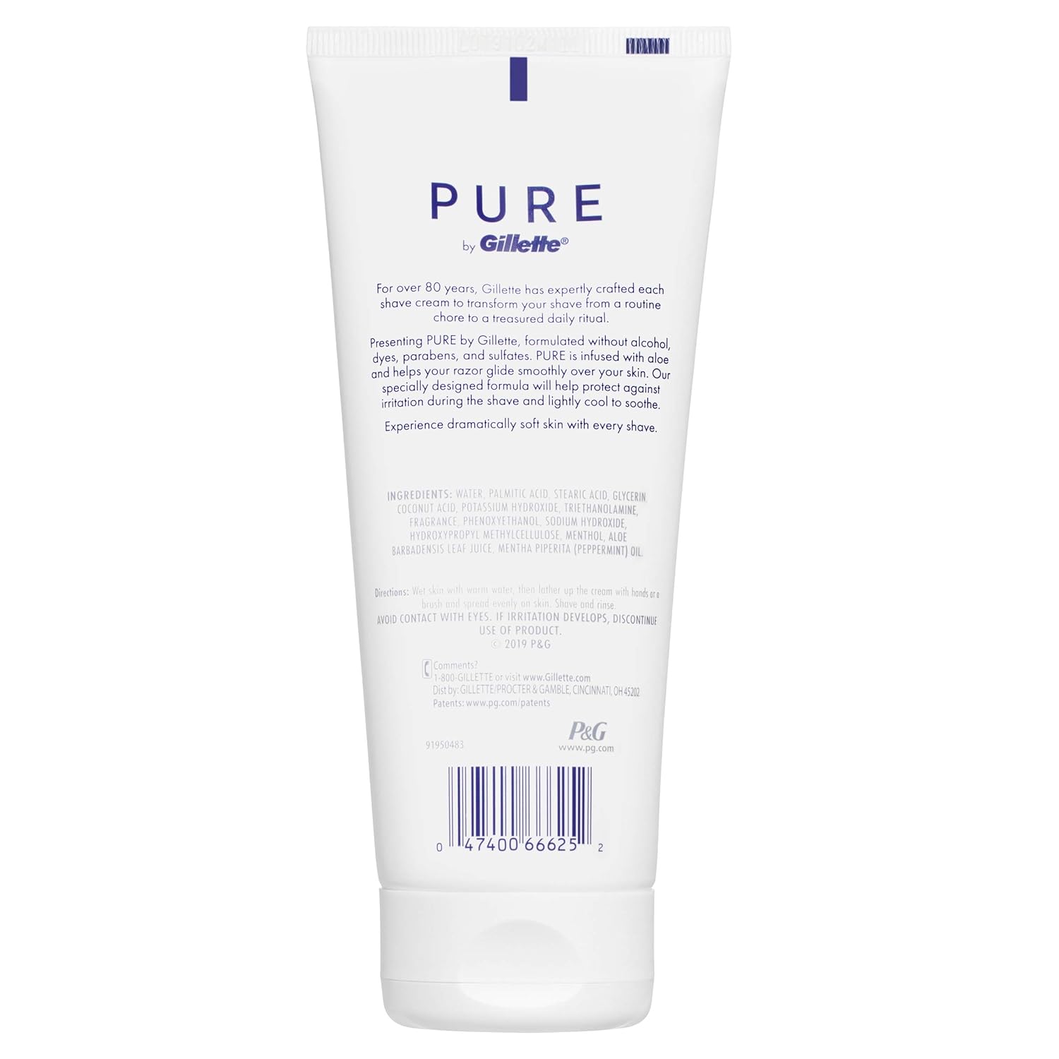 0%; free from sulfates, parabens, dyes, alcohol. For over 80 years, Gillette has expertly crafted each shave cream to transform your shave from a routine chore to a treasured daily ritual. Presenting Pure by Gillette, formulated without alcohol, dyes, parabens, and sulfates. Pure is infused with aloe and helps your razor glide smoothly over your skin. Our specially designed formula will help protect against irritation during the shave and lightly cool to soothe. Experience dramatically soft skin with every shave. www.gillette.com. www.pg.com. Comments? 1-800-Gillette or visit www.gillette.com.