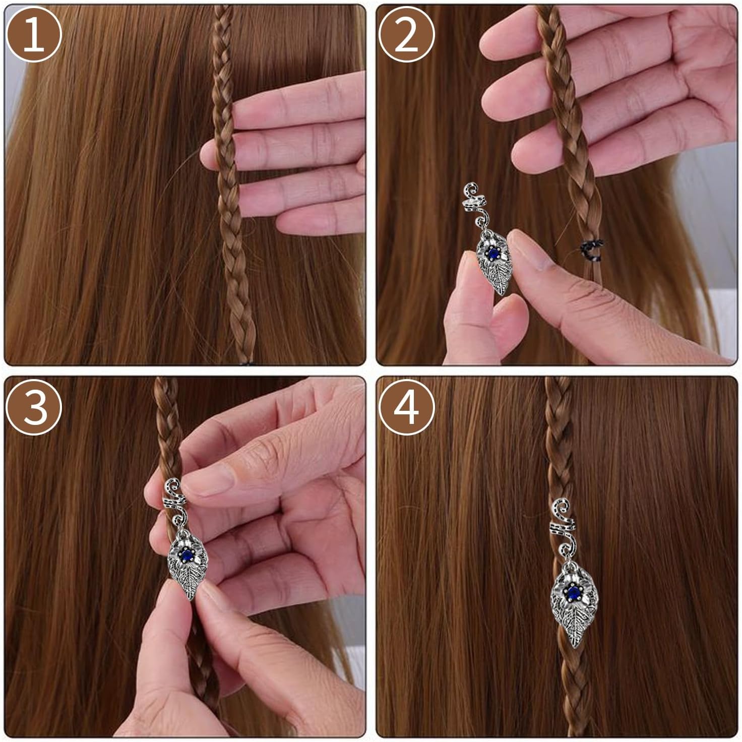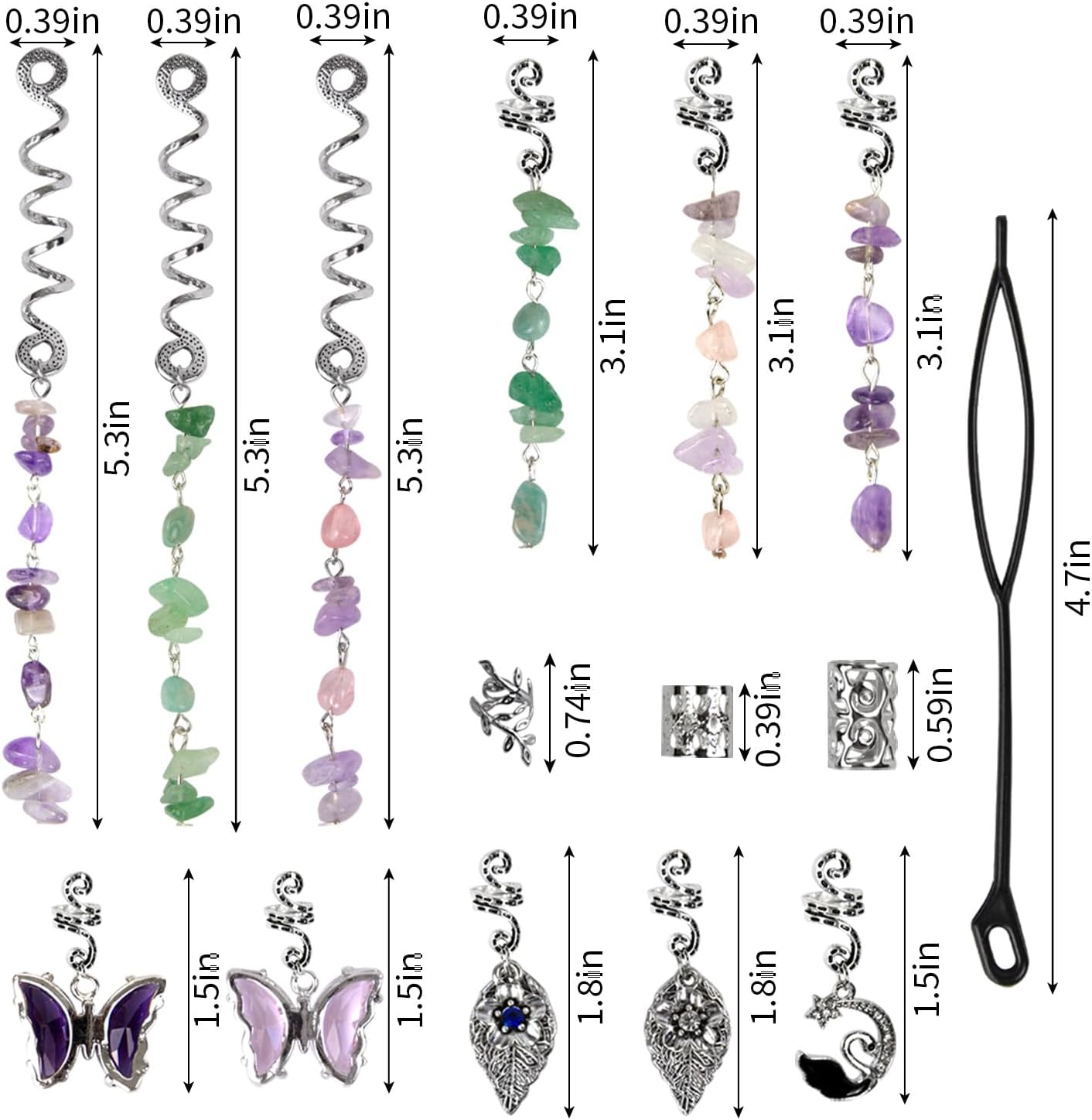 Package Includes :3PCS Long Natural Crystal Stone jewelry for dreadlock extensions; 3 pcs short crystal stone hair jewelry for braids; 2 pcs silver leaves pendent with diomend insert . 1 pc elegent swan pendent ; 4 pcs butterfly pendent with crystal; 10 pcs flower hair clips cuff ; 20pcs round silver cuffs .