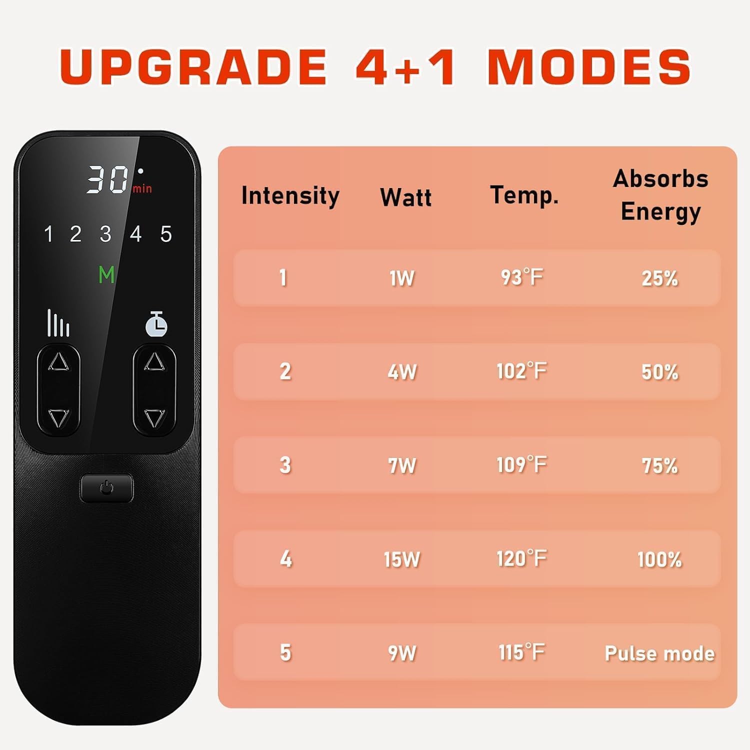 Simple Operation,Portable & Effective—Quick heating pad to keep your feet warm! The combination of 660nm red light + 850nm NIR penetrates solve your problems. Controller can be timed, adjustable mode, 5 modes, choose the mode and power that suits you.