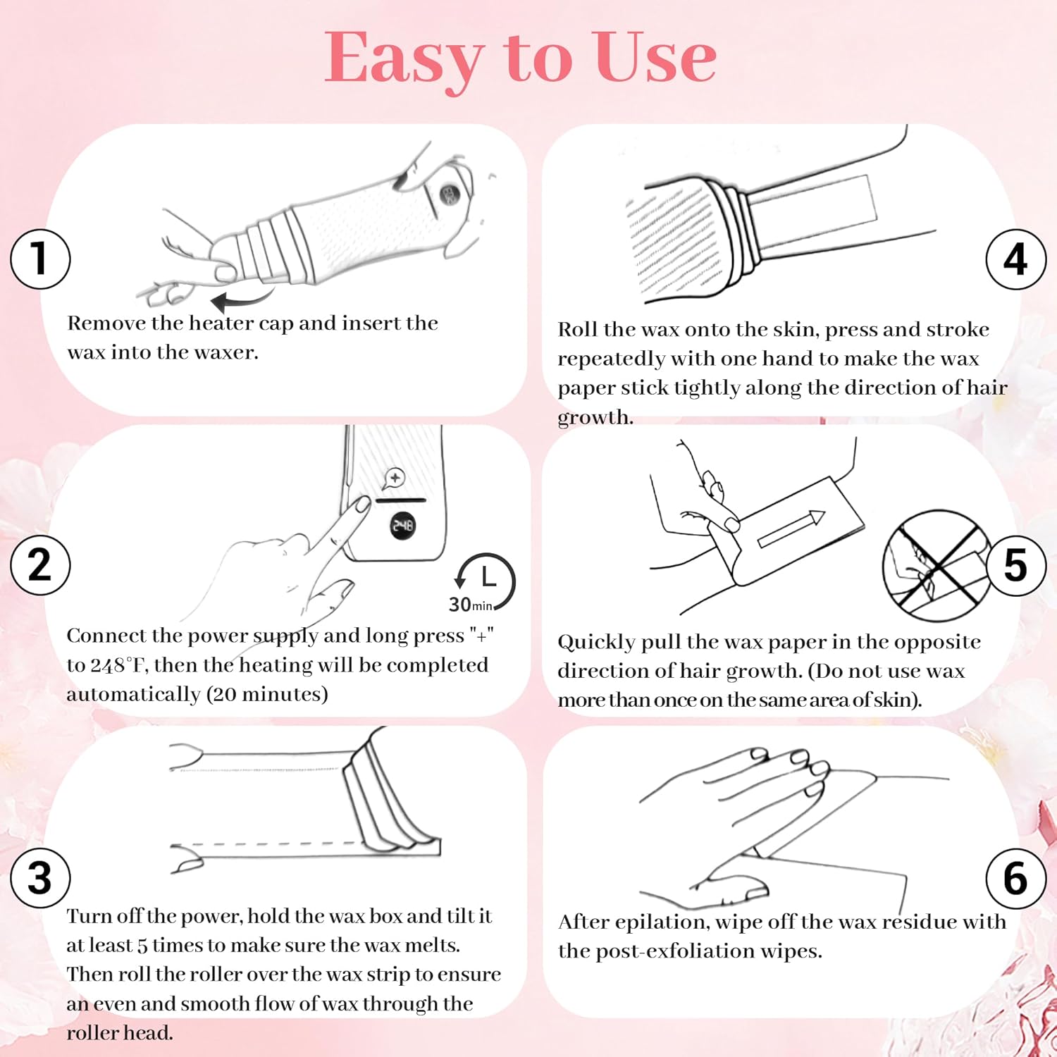 【Wax Roller】: The set includes a black wax machine with LED digital display, as well as 2 natural wax (lavender scented), 100 non-woven wax strips and 10 wipes. Apply molten natural wax to skin, then apply wax strips tightly in the direction of hair growth. After half a minute, quickly peel off the beeswax strip in the opposite direction, and finally use a wet wipe to remove the remaining beeswax.