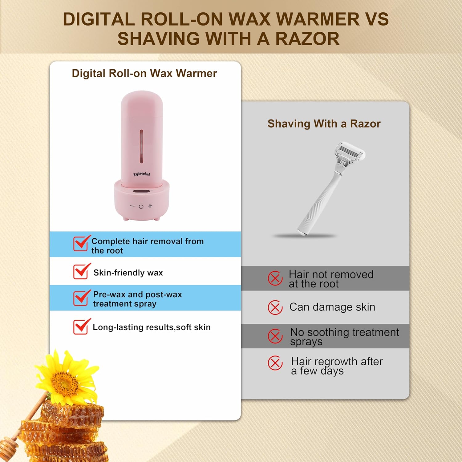 Roll On Wax Kit for Hair Removal – Wax Roller Kit, Digital Wax Warmer, 3 Honey Wax Refills, 100 Waxing Strips, 1 Pre Wax & 1 Post Wax Spray, For Women & Men, Remove Body Hair at Home (Pink)