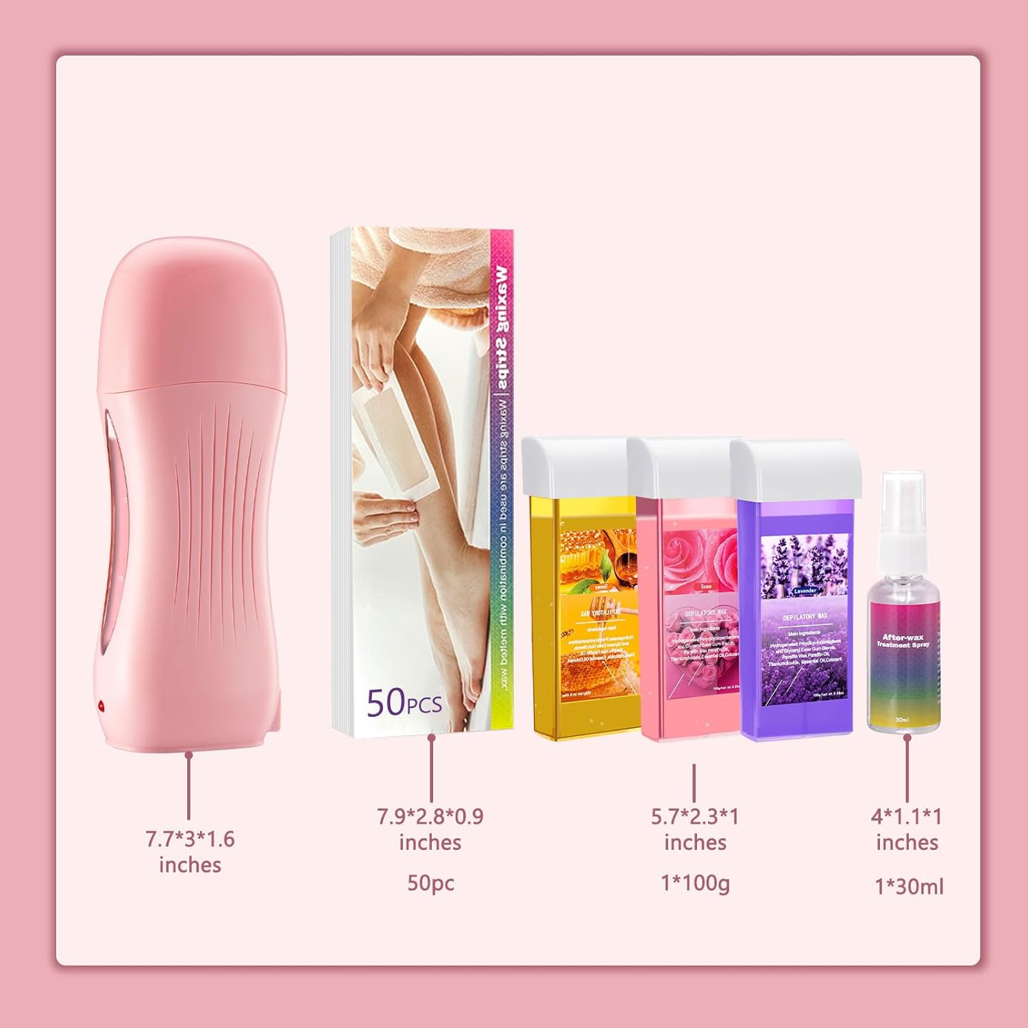 ✅Roll on wax kit includes: 3pcs 100g soft wax roller, 30 ml after-wax treatment spray, 50 non-woven waxing strips. [💝Note] If the indoor temperature is below 10°C, it may take 1 hour or longer for the wax to fully melt, and roll the melted wax strip on the wax paper 5 to 7 times to ensure full coverage and achieve better hair removal results.